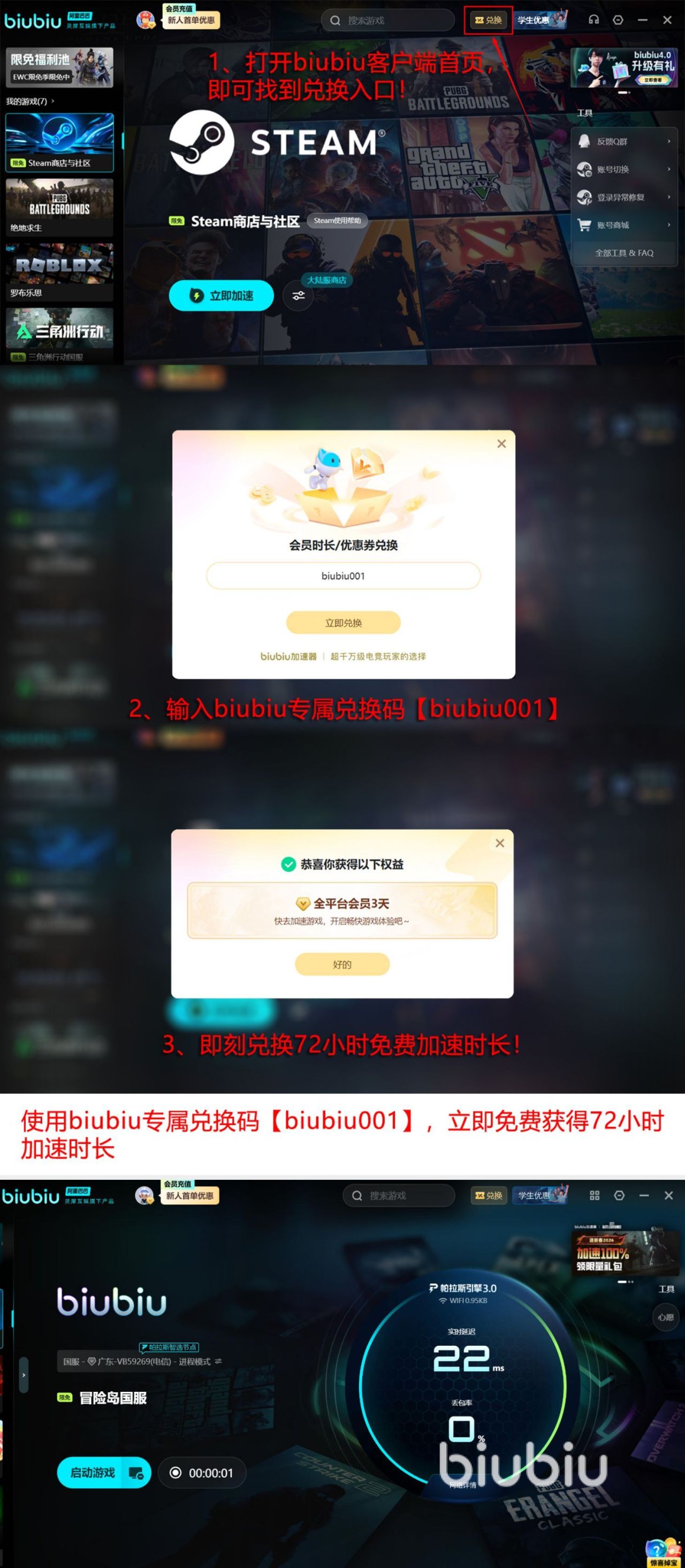在玩很多联机游戏的时候,大家选择介绍的这款能够完成网络优化,甚至是能够进行加速的工具,除了支持很多类型的游戏,在游戏数量上也能够满足很多人的需求。如今免费的加速时长福利,对于每个人来说都可以尽情的享受免费加速时,对游戏带来的很多好处。没有注册过的用户,更是能在注册以后就获得24小时免费加速时长。注册完成以后,也可以通过输入【biubiu001】的方式,获得免费三天加速时长,此次福利对于新用户来说,最多可以领取到96小时的加速时长。