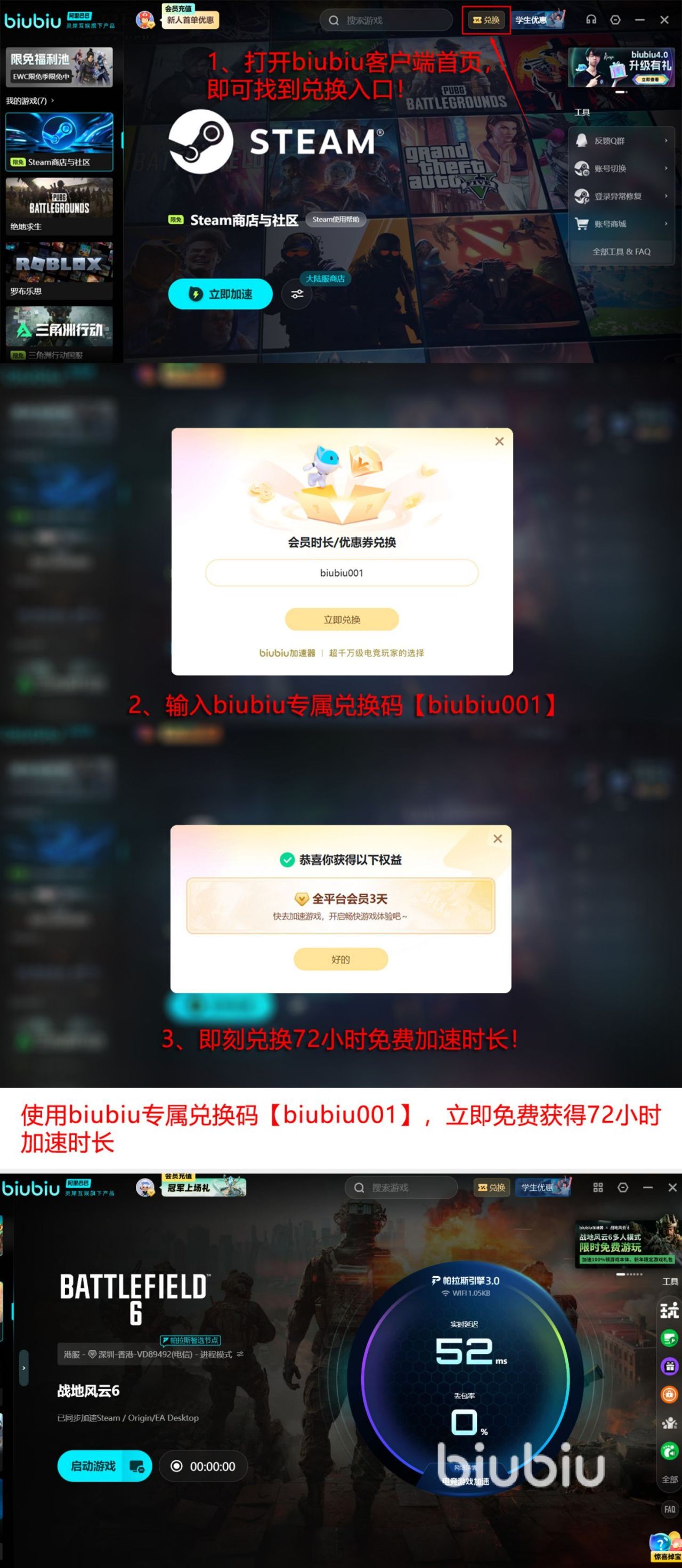 其次还有一个优势,就是出自于大家的角度去考虑问题,为了能够让大家不踩雷,或者不会浪费金钱,因此而推出了很多免费的福利。当我们首次安装并用账号激活之后,就会立即拥有24小时的加速时长,另外在使用【biubiu001】还能够领取72小时的加速时长,那么两种方式共计就可达到96小时。