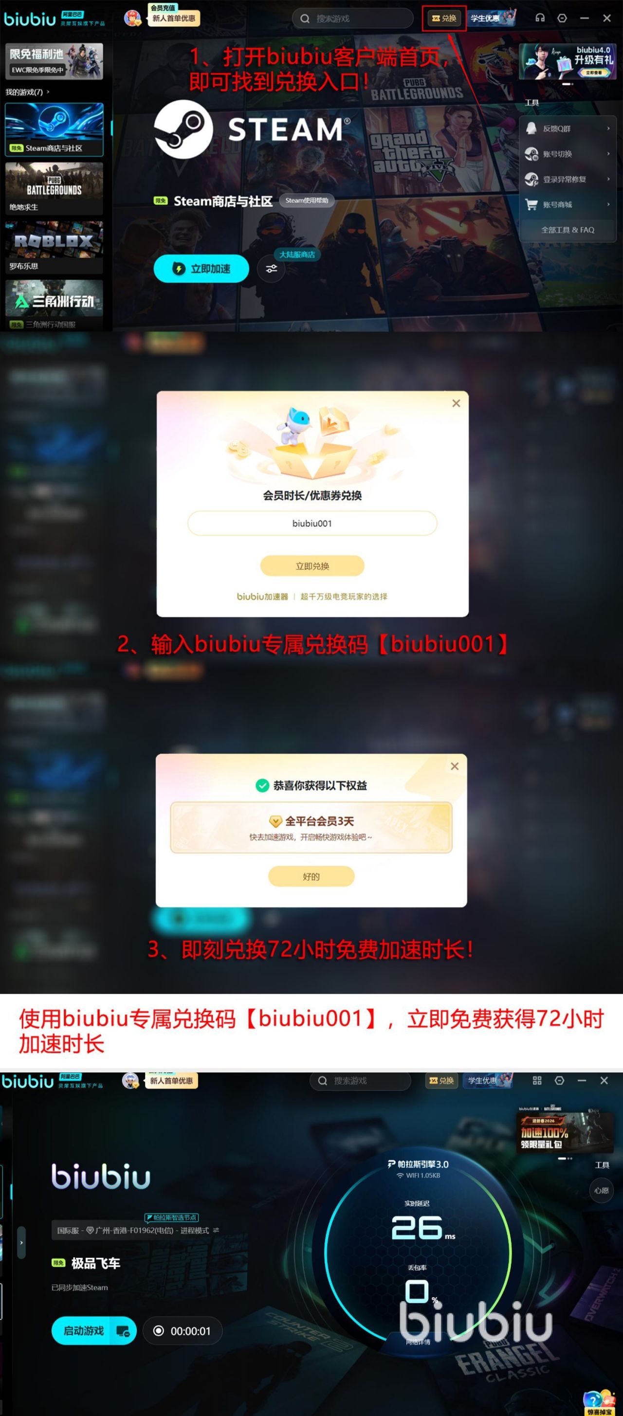 曾经还在很多高强度的场景中得到了更好的实测,有大多数人使用过之后都给予一致好评,就连绝地求生冠军小叮当都极力首推。为了能让大家不踩雷,因此也提供很多免费体验的福利主要分为两种,一种就是当大家首次用账号成功注册后,就会拥有24小时的加速时长,而另外一种就是所有人都可用【biubiu001】,在领取三天的免费加速时长,那么这两种方式都可以同时使用,而并不是只能选择一种,那么就可将免费的时长拉长至96小时。