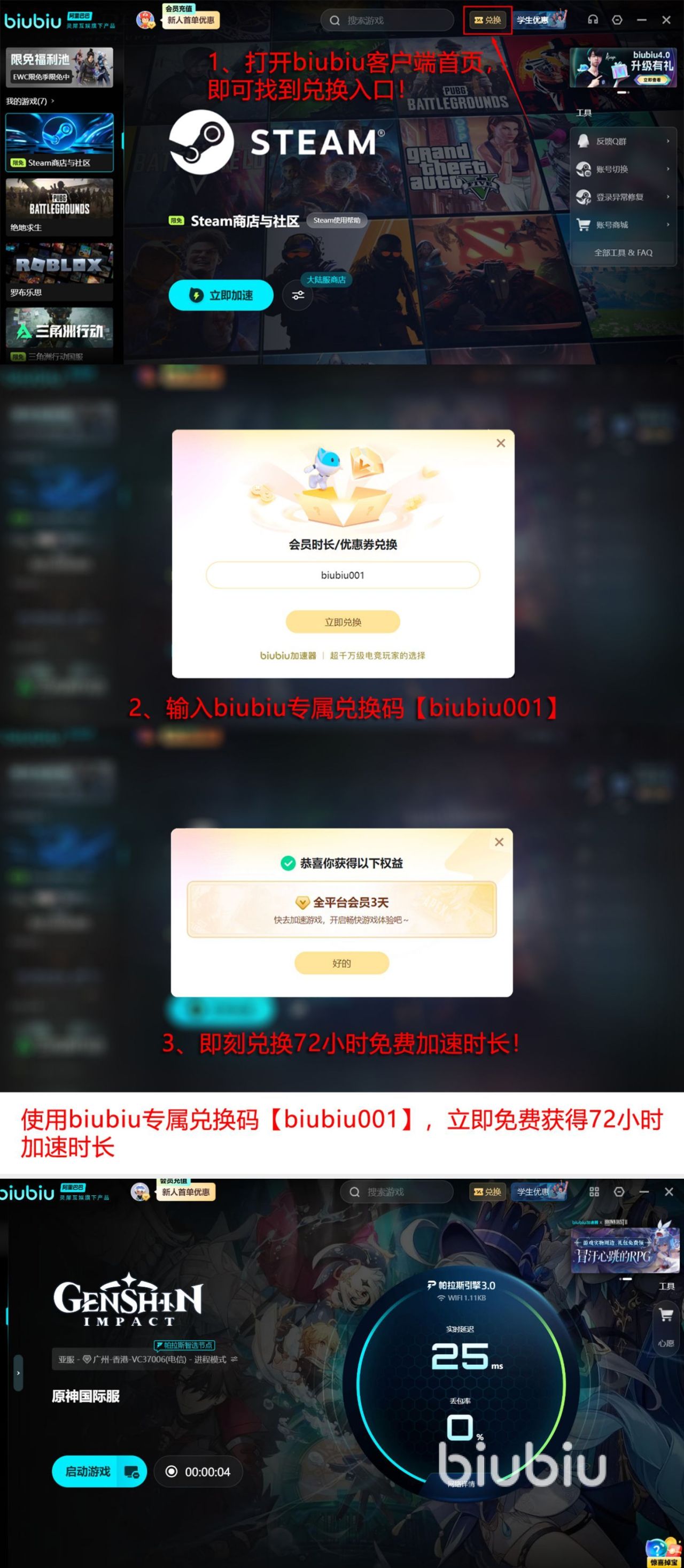 其次还值得大家了解的就是之前也得到了电竞冠军小叮当的大力推荐,而出自于大家的角度来考虑问题的话,也带来了特别贴心的福利,那就是所有的人都可以用【biubiu001】,直接领取72小时的免费加速特权,而大家首次在使用并成功注册的时候,就会拥有24小时的加速特权。那么这样攻击就可以达到96个小时。