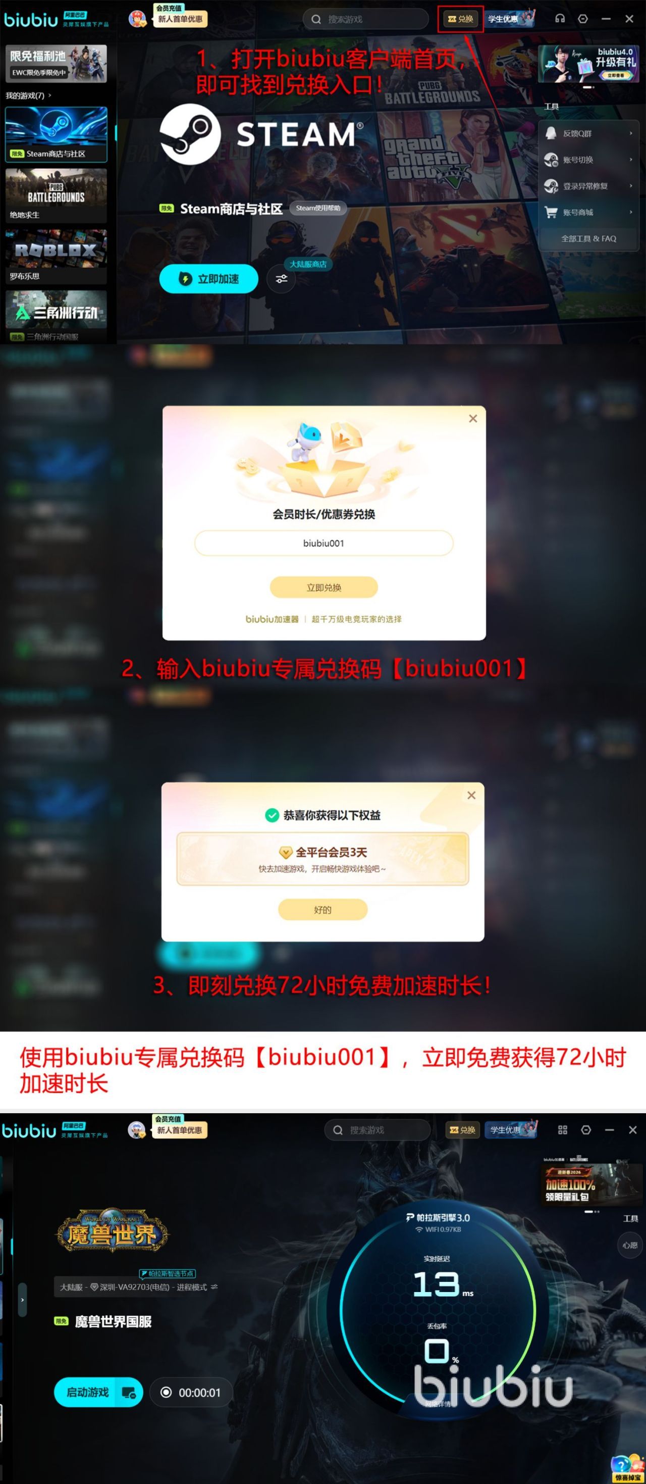 最后就需要着重从福利方面来看了,所有人都可以拥有免费体验的96个小时,对于所有新人来说,当大家首次利用账号成功注册之后,就会立即拥有24小时的免费加速特权,而另外一种就是所有人都可用【biubiu001】,再次获得三天的免费加速特权。