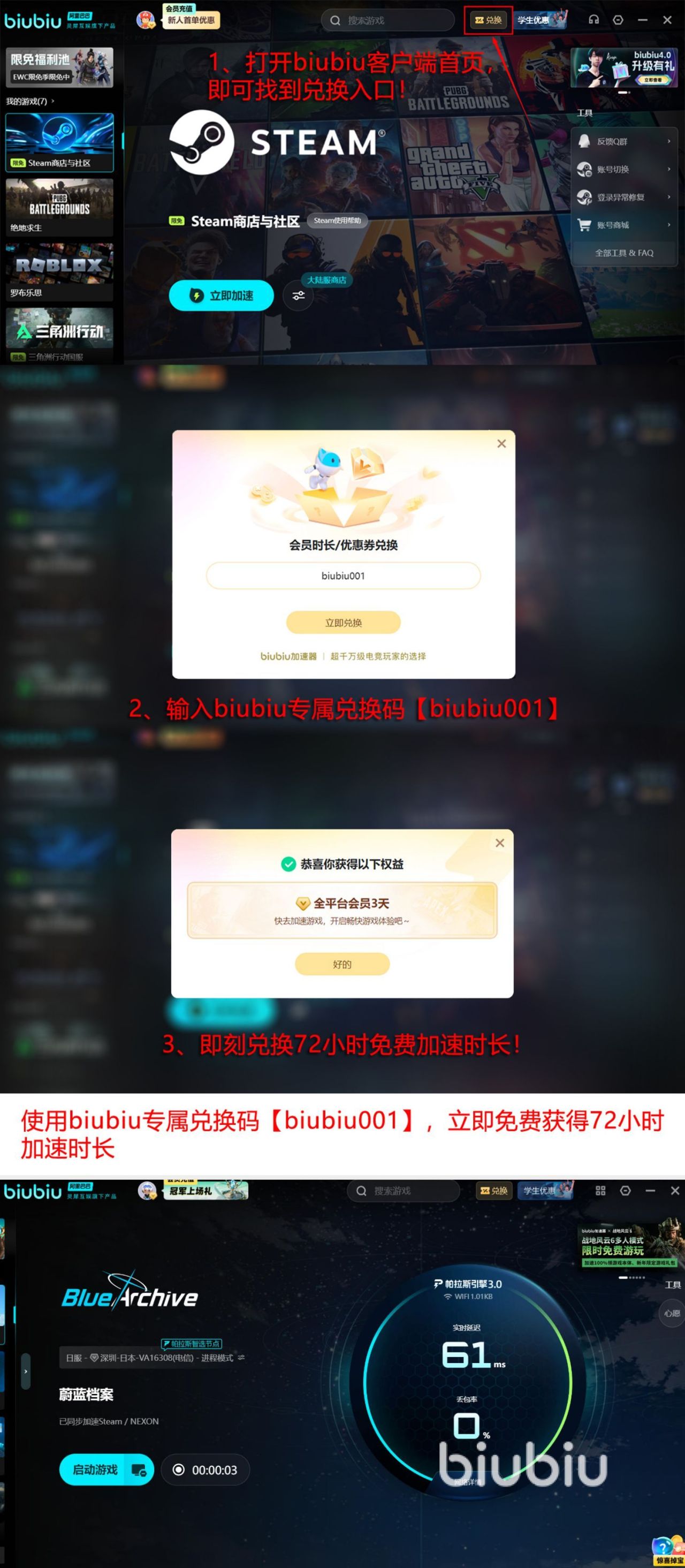 目前所有人都可以领取相应的福利,采用会员加速模式,成为会员之后获得更极速的效果,只需点击链接下载,新用户注册之后就能获得24小时免费加速时长,其次可以使用专属口令【biubiu001】成功获得72小时免费加速福利,两种福利新用户全部领取之后叠加至96小时。