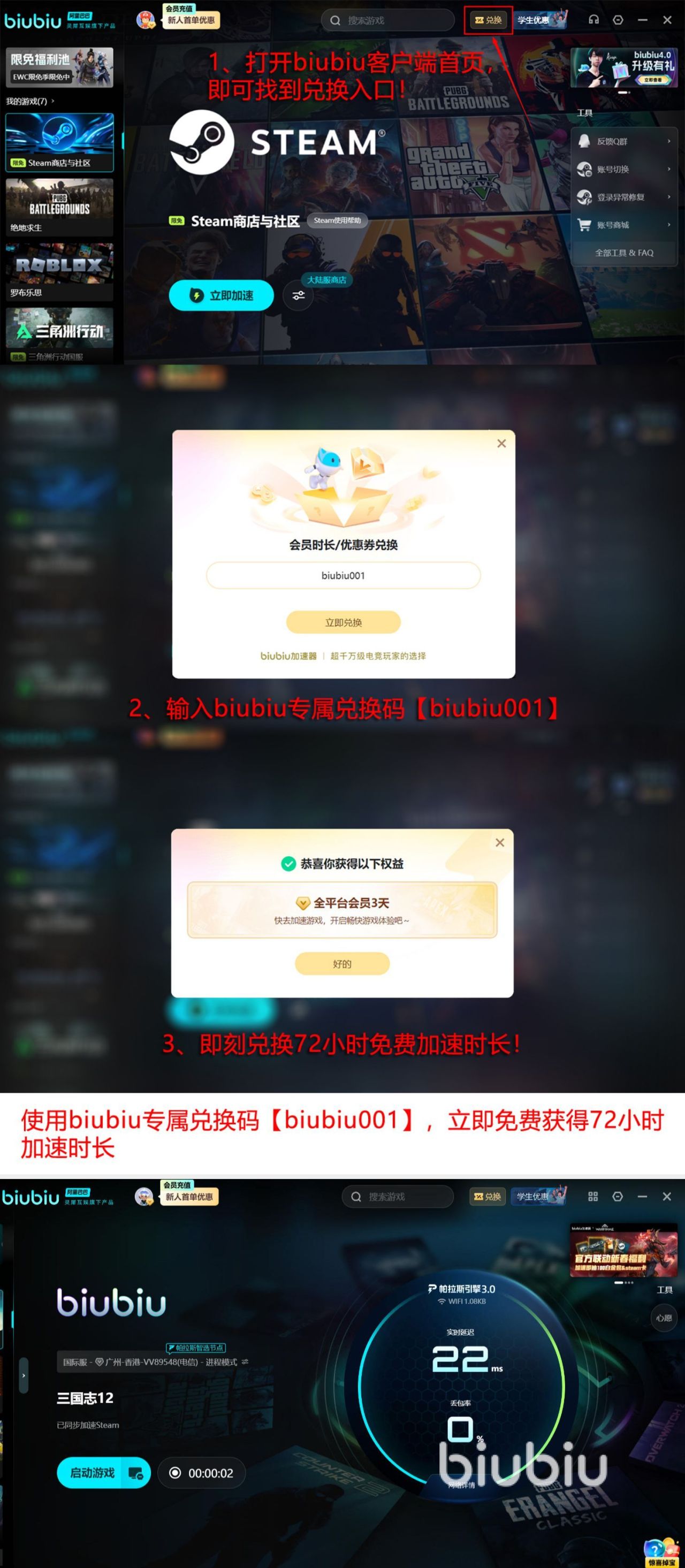 当前针对于所有用户推送出免费试用福利,所有玩家全部都可参与,只要输入口令【biubiu001】在兑换界面就能够成功获得72小时免费加速时长。如果你是刚注册的新用户,点击链接下载安装之后,完成实名认证,那么即可成功解锁24小时免费加速权益,新用户能够将两种福利全部领取,最终叠加至96小时。