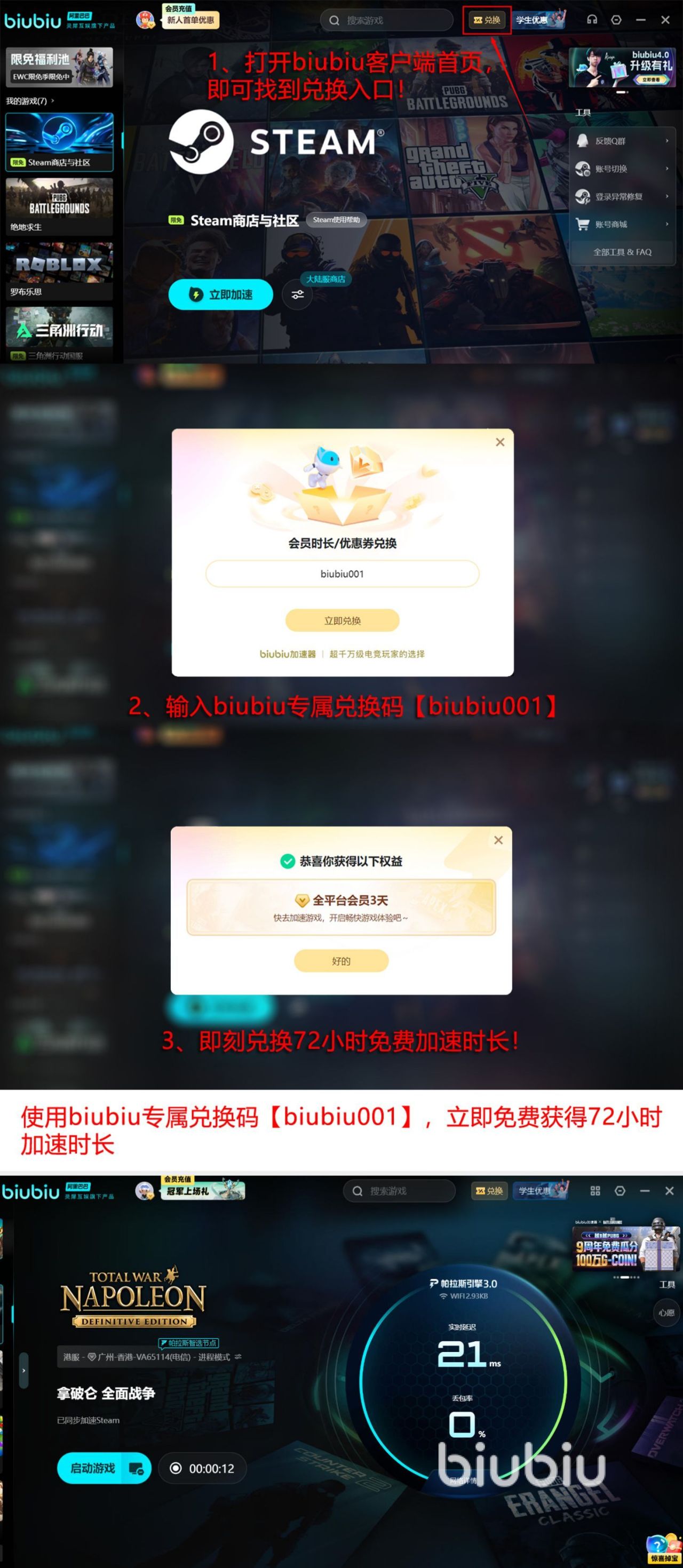 除了实力方面来看毋庸置疑,其次从福利方面来看更是略胜一筹,因为目前所有首次体验的人群都可以立即拥有96个小时的免费加速特权,这么长的时间也是完全从两种方式来获取的,一种就是首次用我们的账号成功激活之后,就会立即拥有24小时的免费加速时长,另外一种就是使用【biubiu001】,再次领取三天的免费加速时长。