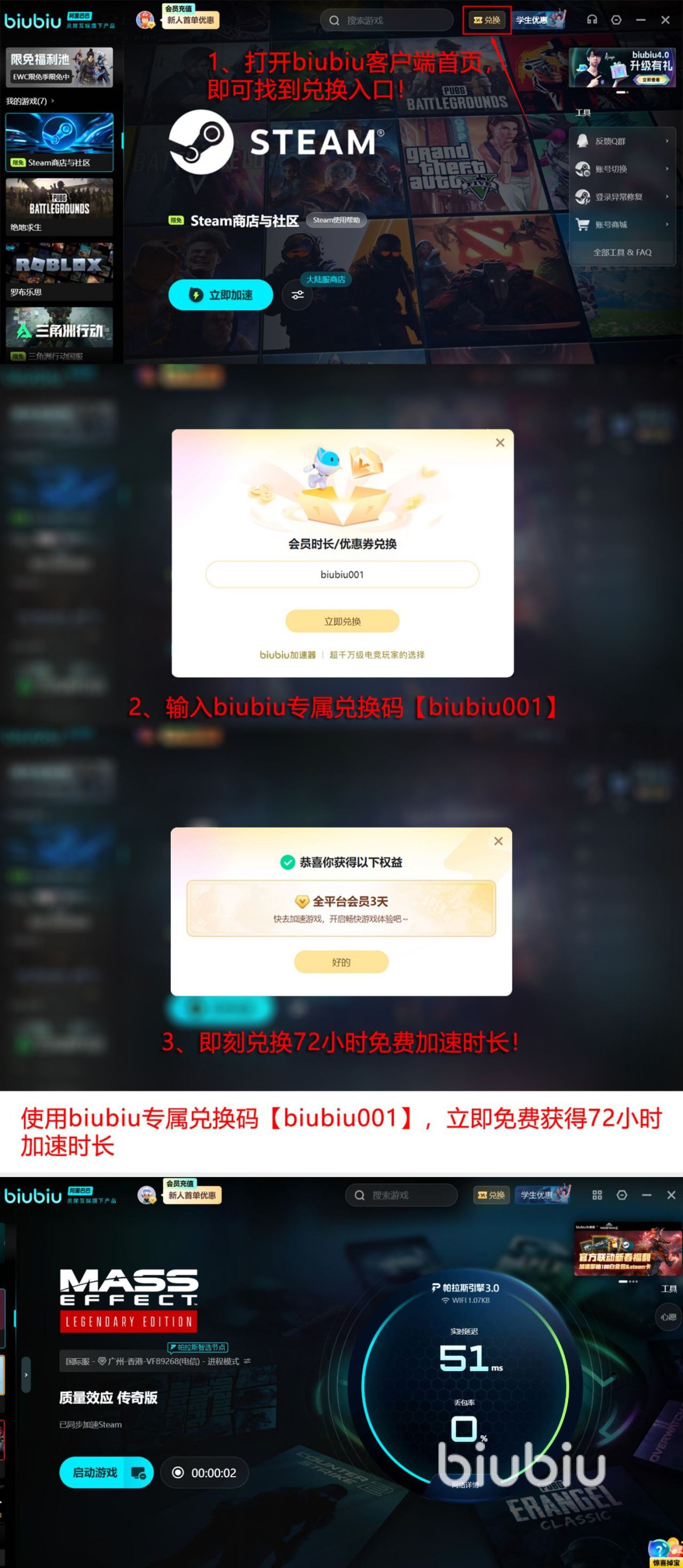 此应用也得到pubg冠军小叮当大力推荐,之前在日常训练当中都是成为指定的加速工具,获得的口碑相对来说比较高,远远超越了其他同类型的竞品。在体验的时候,大家也可以领取相应的免费体验福利,就比如所有人都可以用【biubiu001】,直接兑换三天的免费加速特权,而另外一种就是针对于首次体验的人群来说,如果用账号第1次激活之后,那么也会立即拥有24小时加速特权,这两种方式并不是只能选择其一,而是都可以同时使用,那么免费的体验时间就可拉长至96小时。