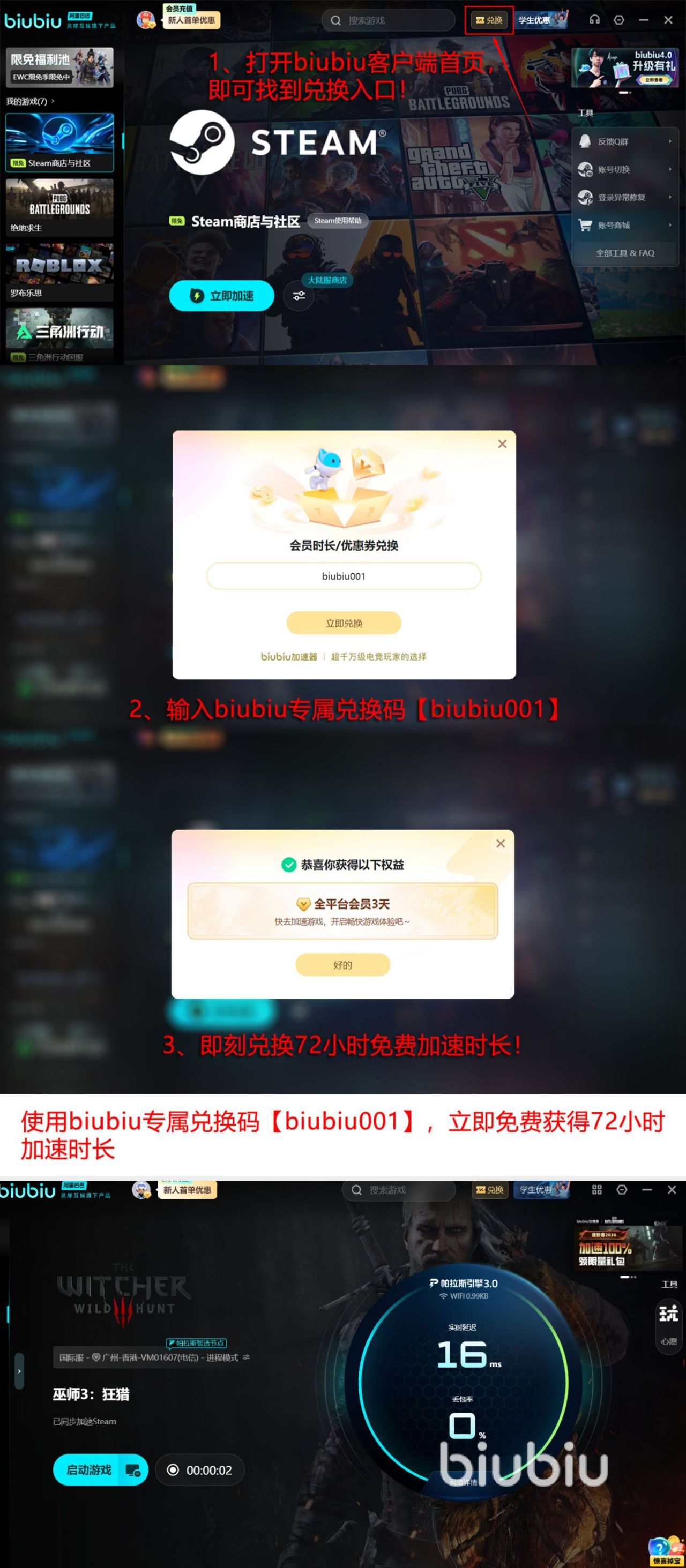 其实很多人还比较担心的就是是否能够免费使用,其实小编给出的答案是完全可以的,因为目前已经携带了很多贴心的福利呈现在大家的眼前,当我们第1次用账号成功激活之后,就会立即获得24小时的加速特权,其次,所有人还能使用【biubiu001】,再额外领取72小时的免费加速特权,其实这两种方式并不是只能选择一种,而是同时都可使用,那么就可将免费的时长拉长至96小时。