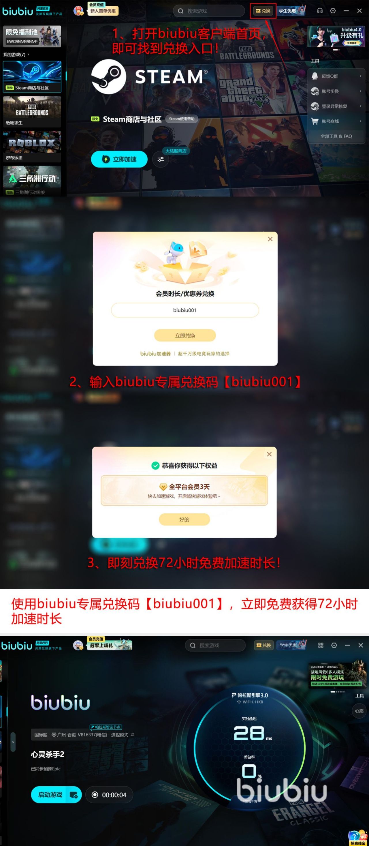 要说真实的实测方面来看,也是有很好的成就成为电竞冠军小叮当大力推荐的一款应用,早在之前成为此应用的产品体验官。目前也不会让大家在体验时出现踩雷的情况,因此提供很多免费福利。当大家第1次用账号成功激活之后,就会拥有24小时的加速特权,另外一种方式就是所有人都可用【biubiu001】,获得三天的免费加速时长,那么对于首次体验的人群来说,共累计就可达到96小时。