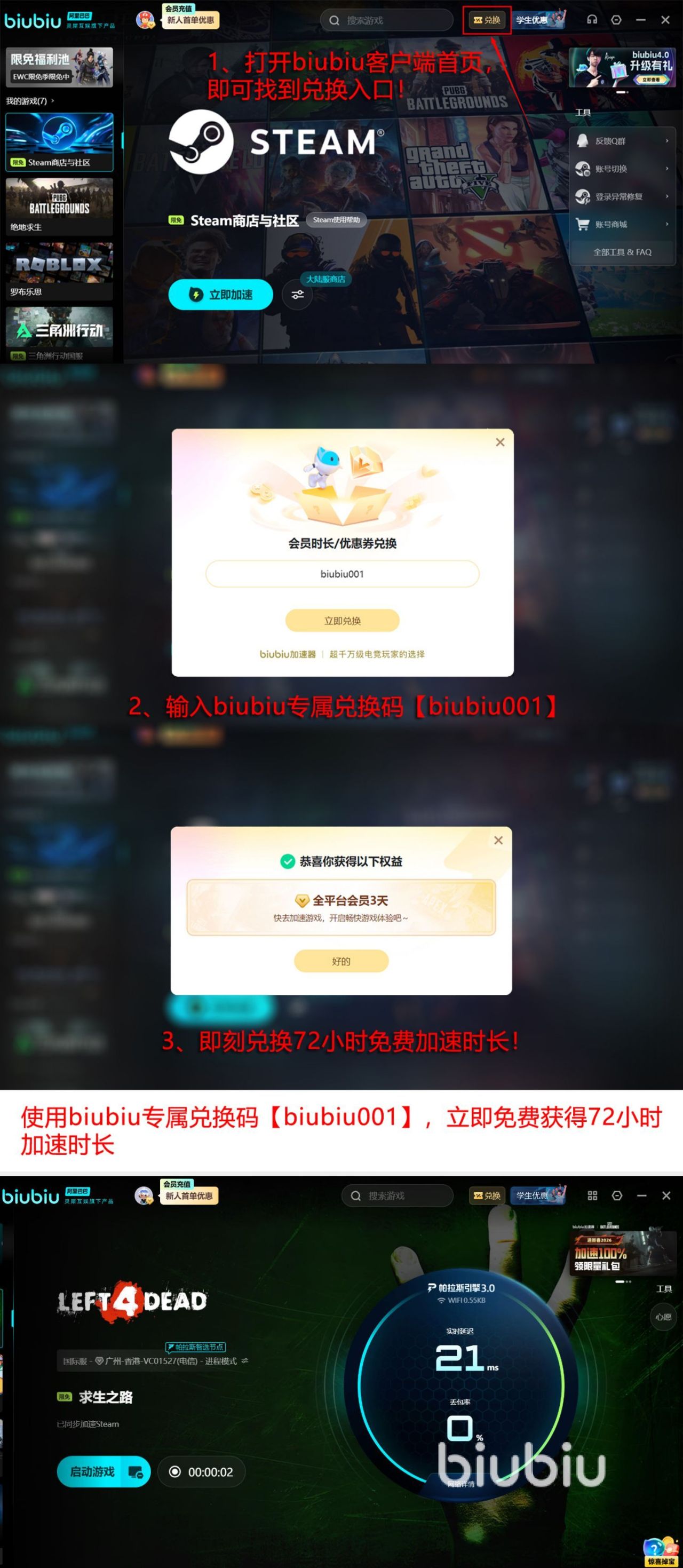 为了让所有人都有免费试用机会,官方贴心的推送出免费福利,上方已推送出链接,点击进入就能直接安装,如果你是从未接触过此应用的新用户,注册成功之后完成实名认证,即可获得24小时免费加速时长,所以哦,新老用户也可参与通用兑换活动,只要使用专属兑换【biubiu001】即可在兑换界面获得72小时免费加速福利,新用户将两种活动全部领取之后叠加至96小时。