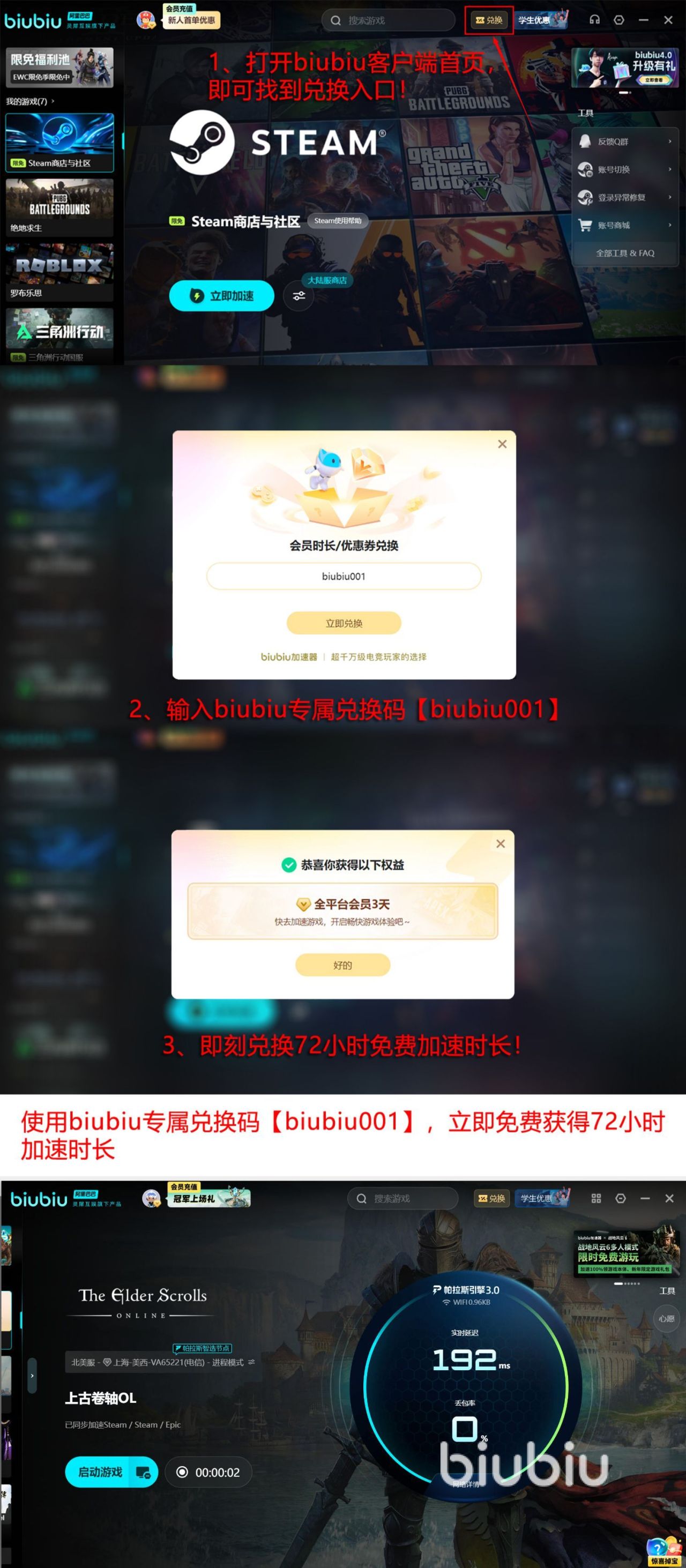 如今为了能够有效减少人们出现踩雷的情况,让大家放心使用,当前推送出一系列相关福利与活动,玩家只要点击上方链接就能下载,新用户注册之后可以成功获得24小时免费加速时长,所有新老玩家可使用兑换码【biubiu001】成功领取72小时免费加速福利,两种福利领取之后,新用户能够叠加至长达96小时。