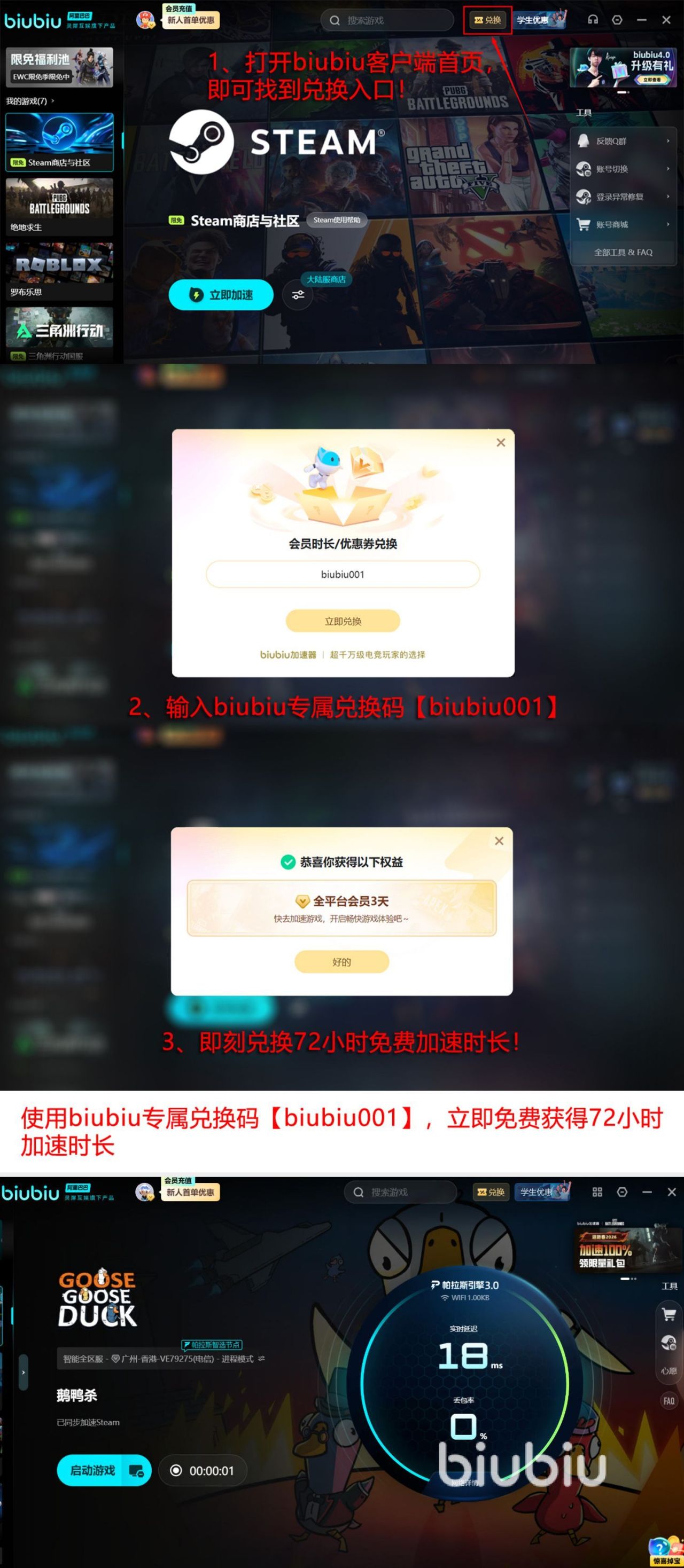 这种情况下通过下载以后,不仅能够在steam平台当中畅玩鹅鸭杀的时候,给大家带来流畅的体验,也能在玩很多游戏的时候,带来优势。如果没有注册过的用户太幸运了,因为如今的福利政策,第一次注册就能够得到免费24小时的加速时长福利,注册以后还可以通过输入【biubiu001】的方式,获得免费三天加速时长。相当于第一次注册的用户,两种方法都可以领取,共计叠加至96个小时,有行业顶尖自研的帕拉斯3.0引擎,背靠阿里巴巴灵犀互娱技术加持。