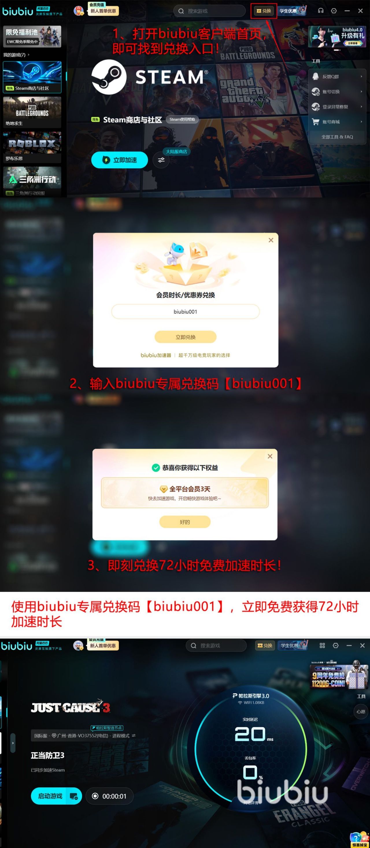 为了能够让每一个玩家,都可通过福利尽情的体验一下,此加速时长在玩游戏时所带来的优势,还可以通过特别简单的方法享受免费加速福利。其中第1次注册的话,直接注册登录就能够得到24小时加速时长,免费的去玩游戏,如果觉得这样的时长并不够用的话,还可以通过输入【biubiu001】的方式,领到三天免费加速时长。这一种也是所有的人都能够领取的,新用户最多可以领取96个小时。
