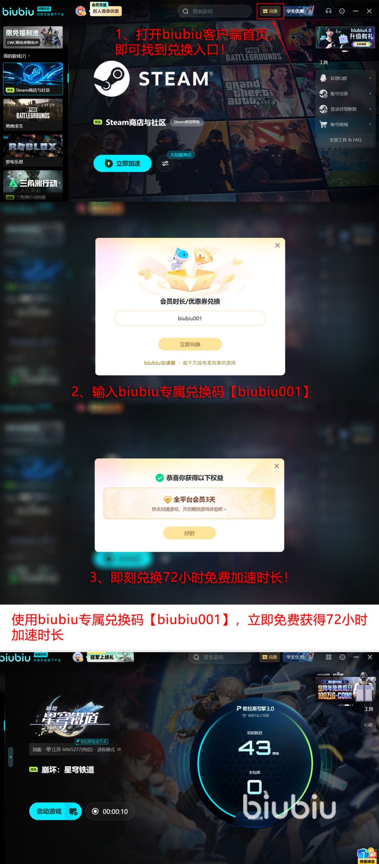 绝地求生冠军小叮当之前也参加了此应用的调校工作,经过了多轮的测试或者是进行优化之后,将特别完美的状态呈现出来,还成为此产品的体验官以及代言人。针对所有的人群来说,也提供很多免费体验的福利,比如当大家首次利用账号激活之后就会获得24小时的加速特权,其次是用完之后还可再用【biubiu001】领取三天的免费加速特权,那么累计下来就可长达96小时。