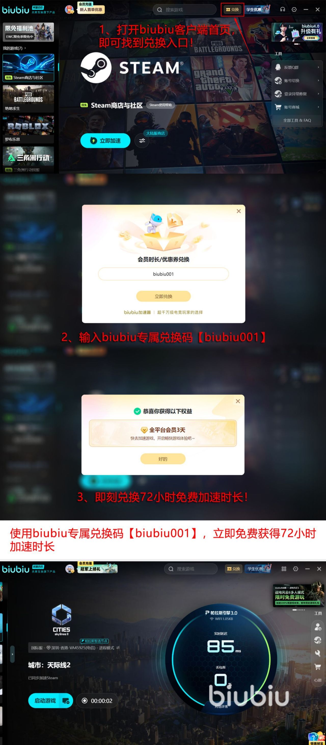 不过出自于大家的角度来考虑问题的话,也给大家准备了丰富的免费体验福利,所有人通用的那就是使用【biubiu001】直接兑换三天的免费加速特权,其次首次成功注册的人群还能拥有24小时的免费加速特权,如果将前者也共同使用的话,那么就可将时间拉长至96小时。