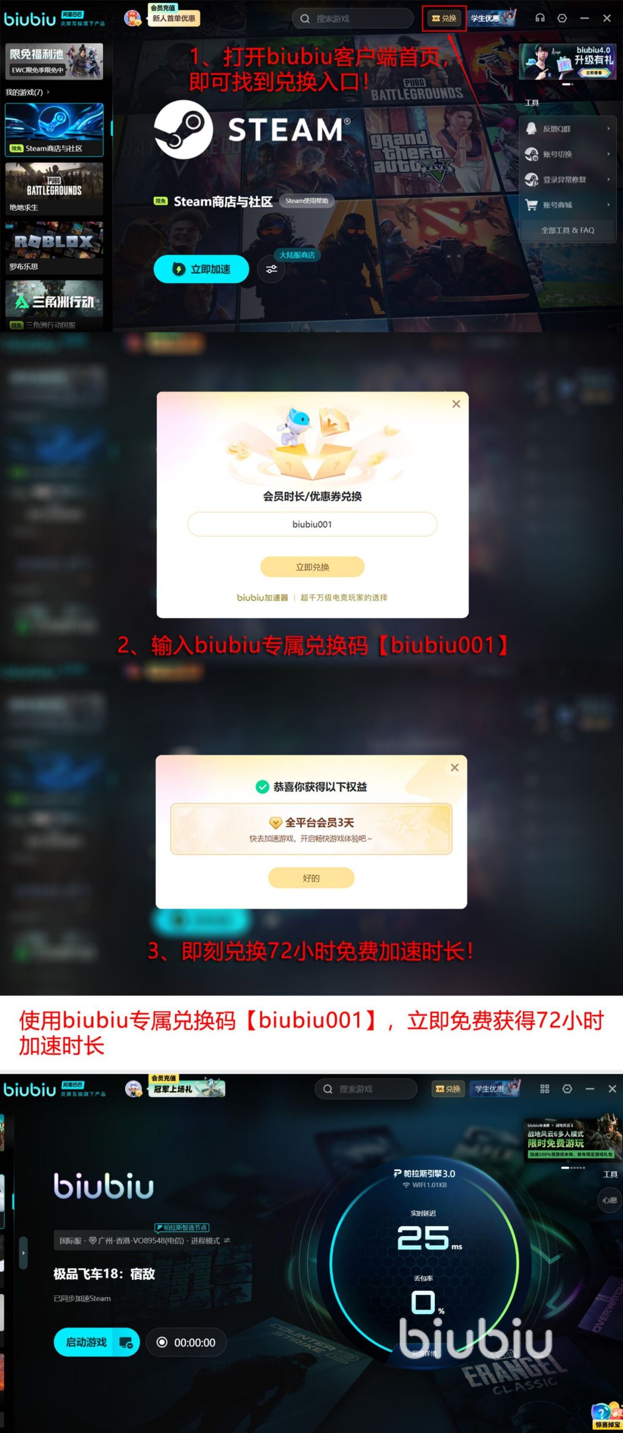 目前所有用户都能够免费获得加速时长,尝试之后再决定是否要长期使用,新用户注册账号即可成功解锁24小时全平台加速权益,新老用户使用口令【biubiu001】就能成功领取72小时免费加速时长,是两种福利全部领取之后,新用户能够叠加至96小时。