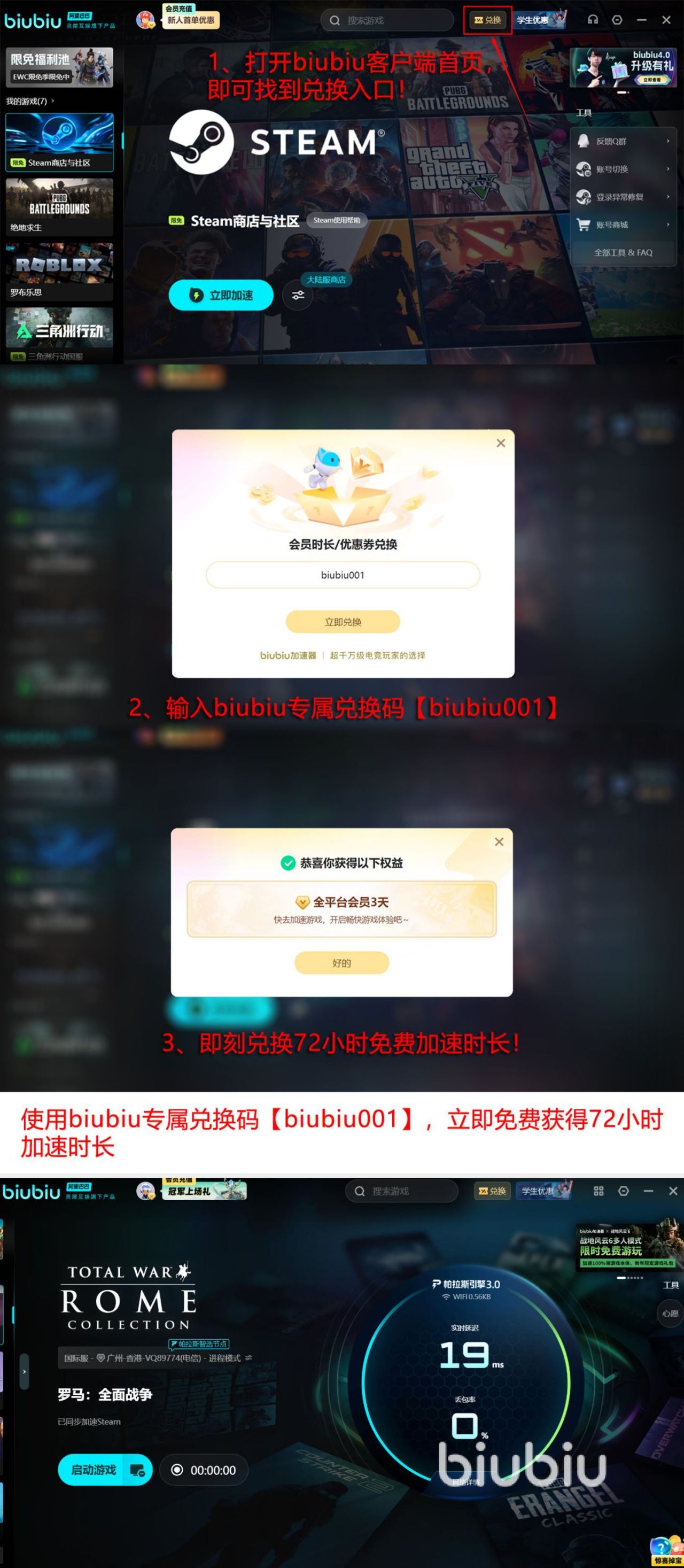 当前推送出一系列相关福利,所有玩家都能够参与并免费获得加速机会,只要点击链接下载新用户即可获得24小时免费加速时长,所有新老玩家也可以使用兑换口令【biubiu001】成功获得72小时免费加速福利,两种福利全部领取之后能够叠加至96小时。