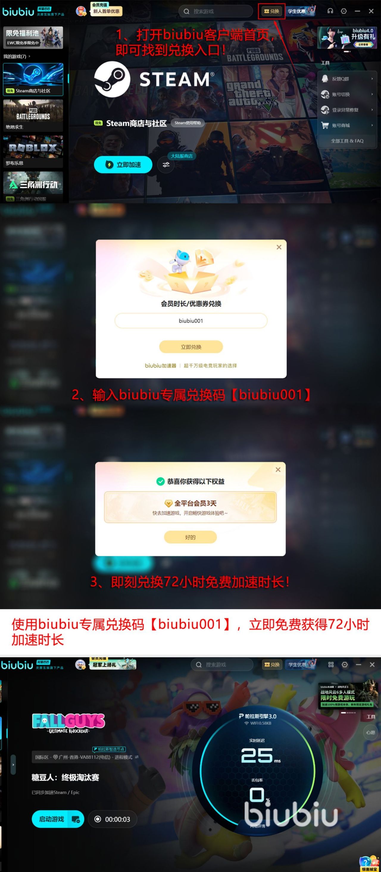 之后就要从所携带的福利方面来看了,因为目前已经给大家提供了很多免费体验的权限,绝不会担心大家在体验时会出现踩雷的状况,首先,所有首次体验的人群,只要用账号成功激活之后,就会立即拥有24小时的免费加速特权,这对于所有人群来说也特别人性化,特别贴心,那就是利用【biubiu001】直接能够兑换72小时的免费加速特权,那么如果累积下来就可长达96小时。