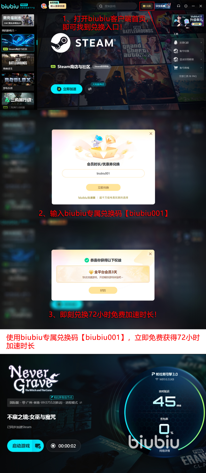 收集遗物的过程确实比较考验操作,也会有更多的探索乐趣。流畅的游戏体验,离不开靠谱的加速器。biubiu加速器有PUBG冠军选手小叮当的代言,还有帕拉斯3.0引擎+阿里巴巴灵犀互娱大厂技术。所以当大家在使用时就无需担心,现在还有免费的专属福利可以使用。新老用户都可以通过【biubiu001】领取3天的加速时长。当然接下来还有一个好消息,如果是新玩家在第1次注册加速器之后,也可以免费24小时。那么就意味着新手可以免费长达96小时。