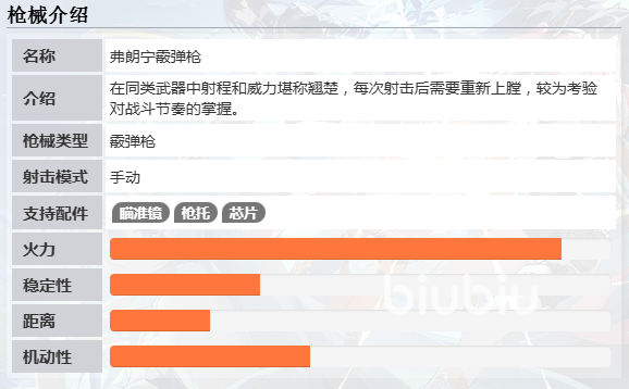 弗朗宁霰弹枪在同类武器中,无论是威力还是射程都是顶尖的水准。近距离贴脸射击时就可以做到一击制敌,唯一的缺点就是在每一次射击之后,就需要重新的上膛,这就会比较考验玩家对于战斗节奏的把控。可以搭配瞄准镜,还有枪托配件,就可以更好的提升精准度,还有稳定性。