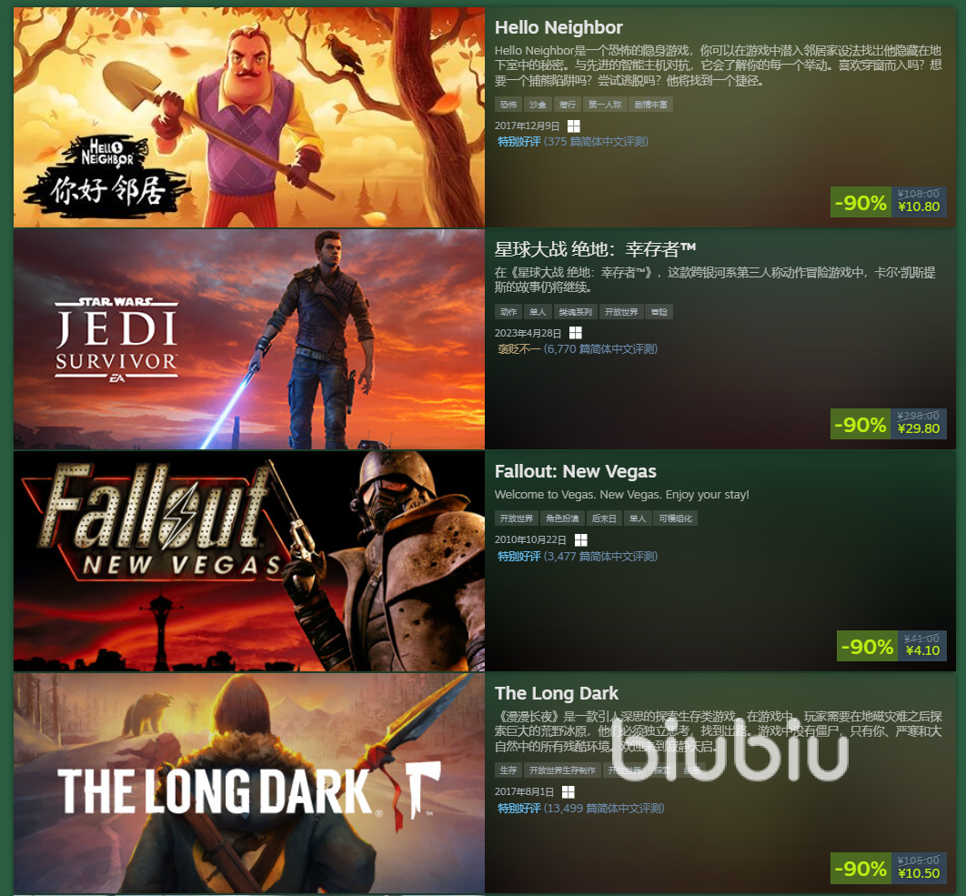 即日起,春促活动已经展开了,具体折扣都已经公布。steam平台为了方便大家查看,也是分类归纳,用列表模式给大家看有什么游戏处于超低价格。像Hello Neighbor、星球大战绝地:幸存者、Fallout: New Vegas跟漫漫长夜这些,就在深度折扣列表中,特惠上还有特惠,只要1折就能买到,可考虑购入。