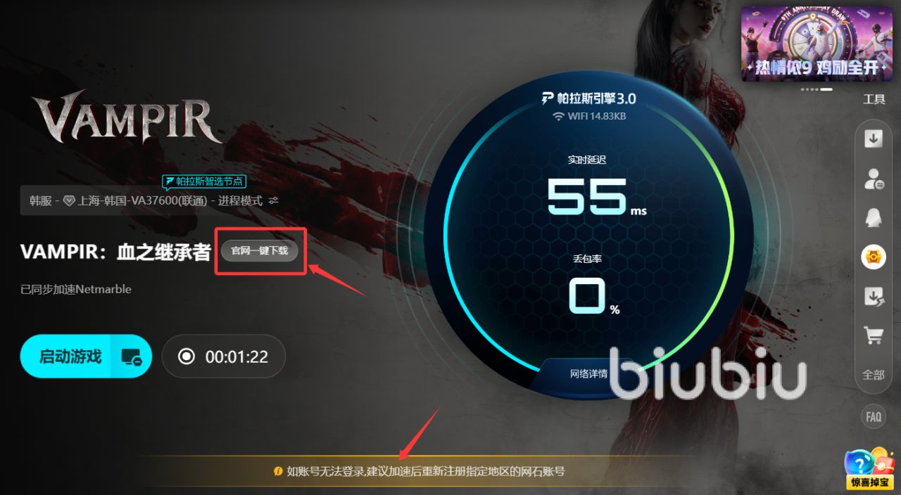 2026年03月23日 18:59 来源:熔炼风布玛9作为一款以吸血鬼为主要人物的超好玩游戏《VAMPIR:血之继承者》,相信很多人都想下下来好好的玩一玩,但是很可惜这款游戏它的IP很容易受到限制。因此VAMPIR血之继承者IP受限我们就很难下下来玩,那么想要解决这个问题该怎么办呢?小编这里有个奇招那就是使用综合性能最强的biubiu加速器。