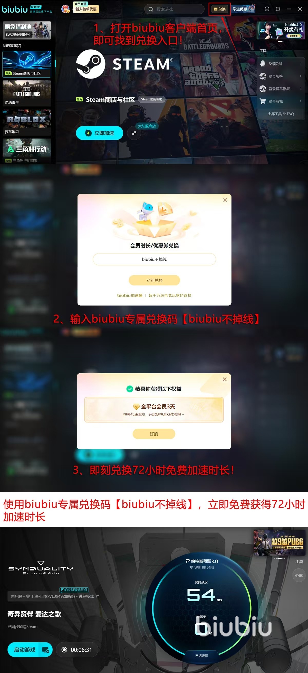 现在有试用福利送,试试又不会亏。抓紧来注册账号,获取的是免费的24小时服务时间用,这些用完了还能领,首页兑换栏处输入【biubiu不掉线】就行了,这下会多得到72小时免费服务时间用,新人其实是最划算的,因为可以一口气用上96小时免费服务,那还不抓紧去领。