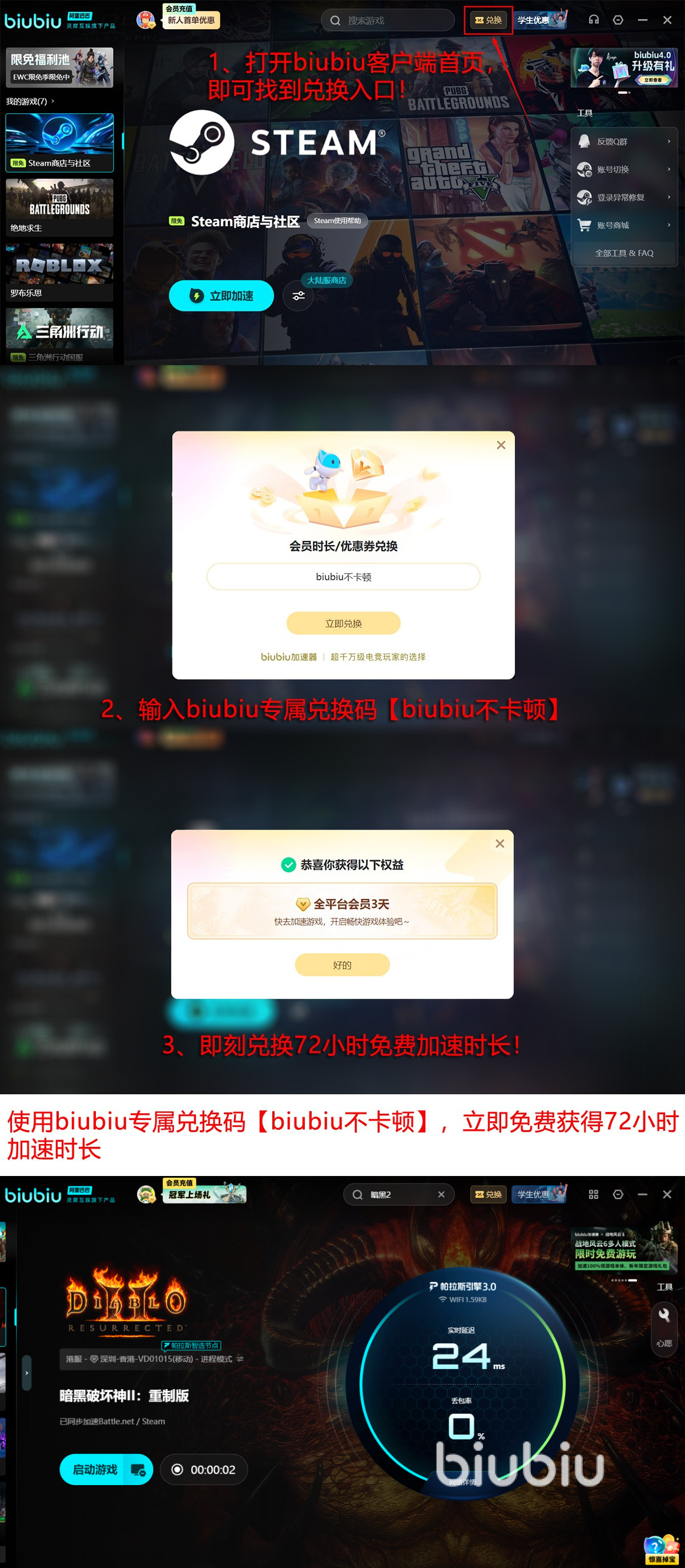 现在开始加速体验的话新人更可马上拥有长达24H的免费加速体验时长!此外所有用户都能依靠兑换码【biubiu不卡顿】额外换取一次三天免费加速权益!新人可以连续叠加这两种福利就能一次性免费畅玩96H,在这段时间内足以攻坚很多主线任务中的副本了。若是定期关注平台活动的话依然可获得海量福利!