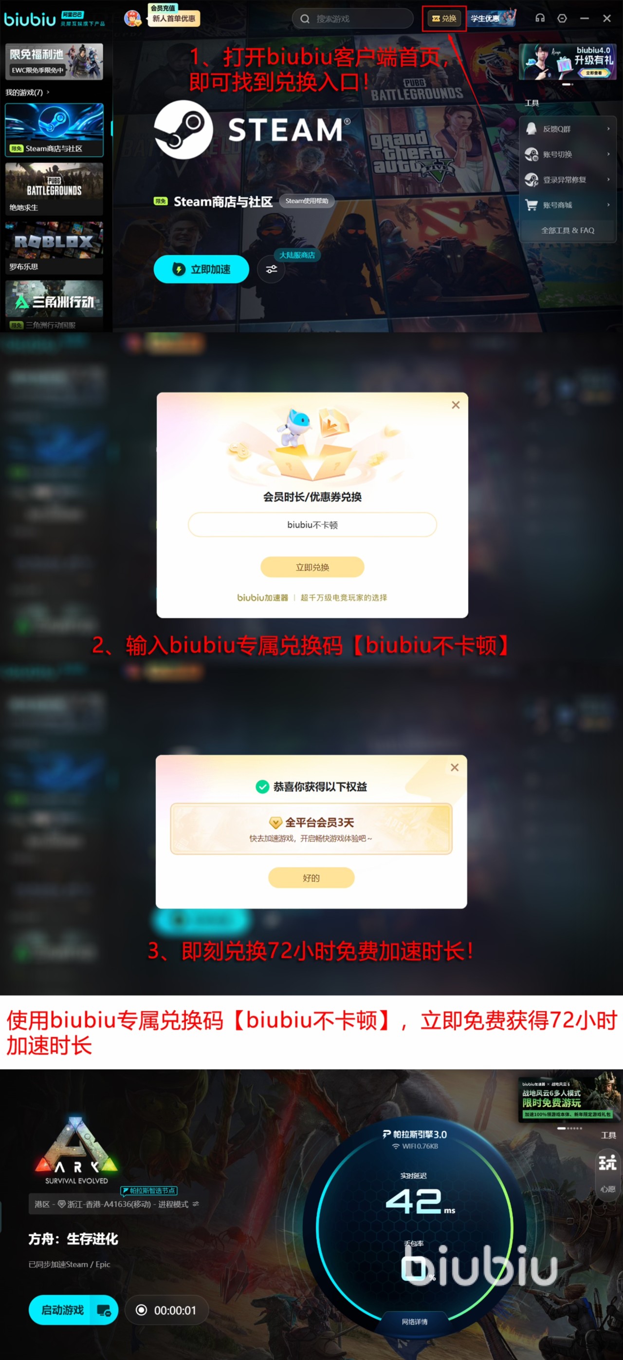 在biubiu上,如果是新用户的话,在开通账号并激活之后就能直接得到24h的免费加速福利,另外输入【biubiu不卡顿】的话,还能兑换3天的加速时间,这个福利可是面向加速器上所有已经注册过了的用户,这样的话,新用户就是能最多获得96h的加速时间。