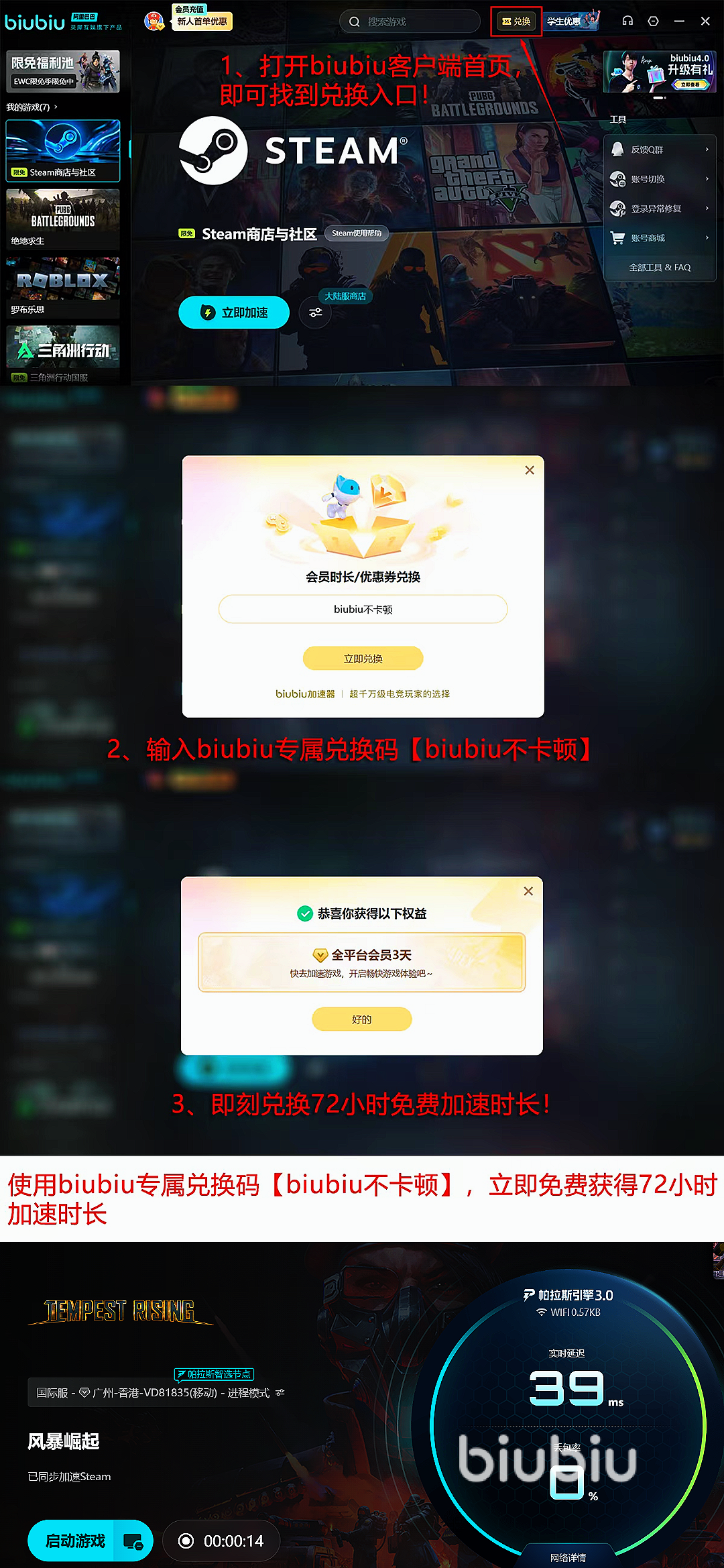 同时新用户注册账号就能立即享受24小时全游戏不限速免费加速,各类网游都能实现流畅稳定运行。全体用户在兑换中心输入专属码【biubiu不卡顿】,还能额外获得3天免费加速时长,其中新用户可以累计叠加两个福利,获得96小时的免费加速哦。