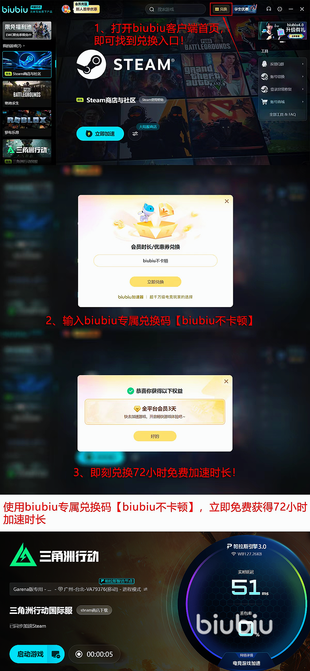 同时新用户注册即享24小时全游戏不限速免费加速特权,无需付费即可体验专业级的网络加速服务,全部用户输入口令【biubiu不卡顿】至兑换中心,所有用户均可额外解锁3天免费加速,其中新用户可以累计叠加两项福利获得96小时的加速哦。