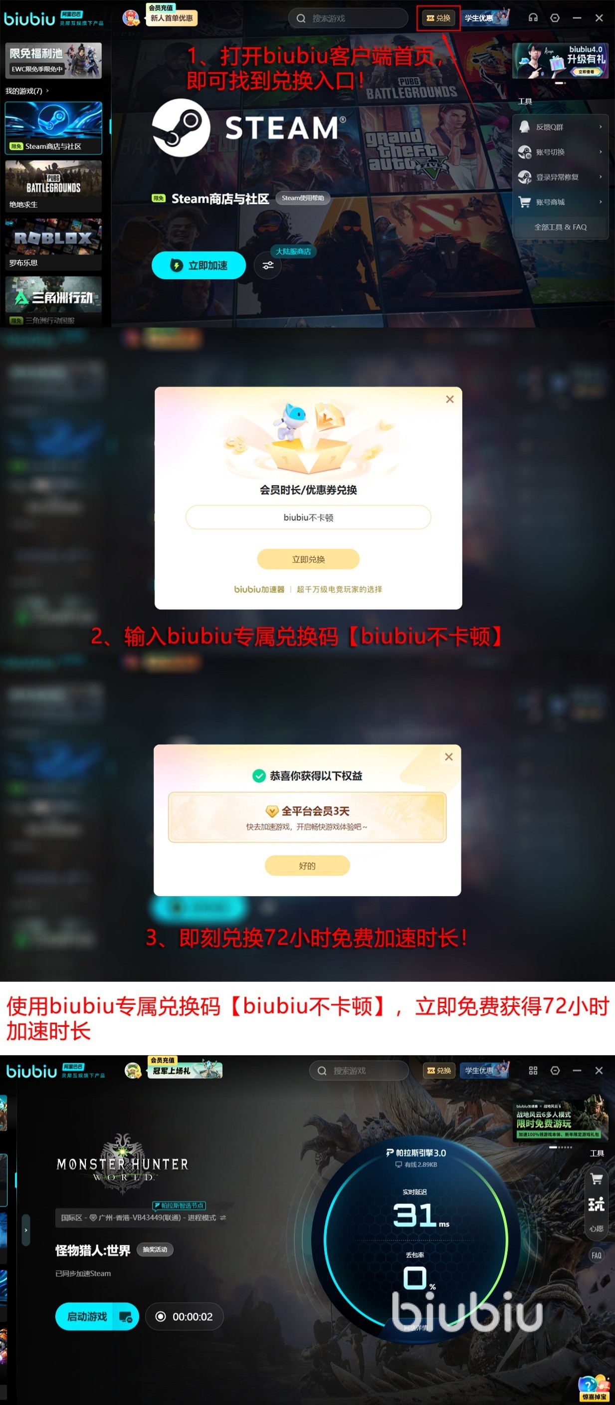 现在正是入手biubiu的最佳时机!现在注册的新用户就送24小时免费加速时长,注册就能用一点不骗氪。同时为了感谢玩家们的支持和厚爱,现阶段新老用户客户端首页兑换入口打开后输入【biubiu不卡顿】就能获得活动专属的72小时加速资格,如果是新用户就可以叠加享受整整四天的免费时长!