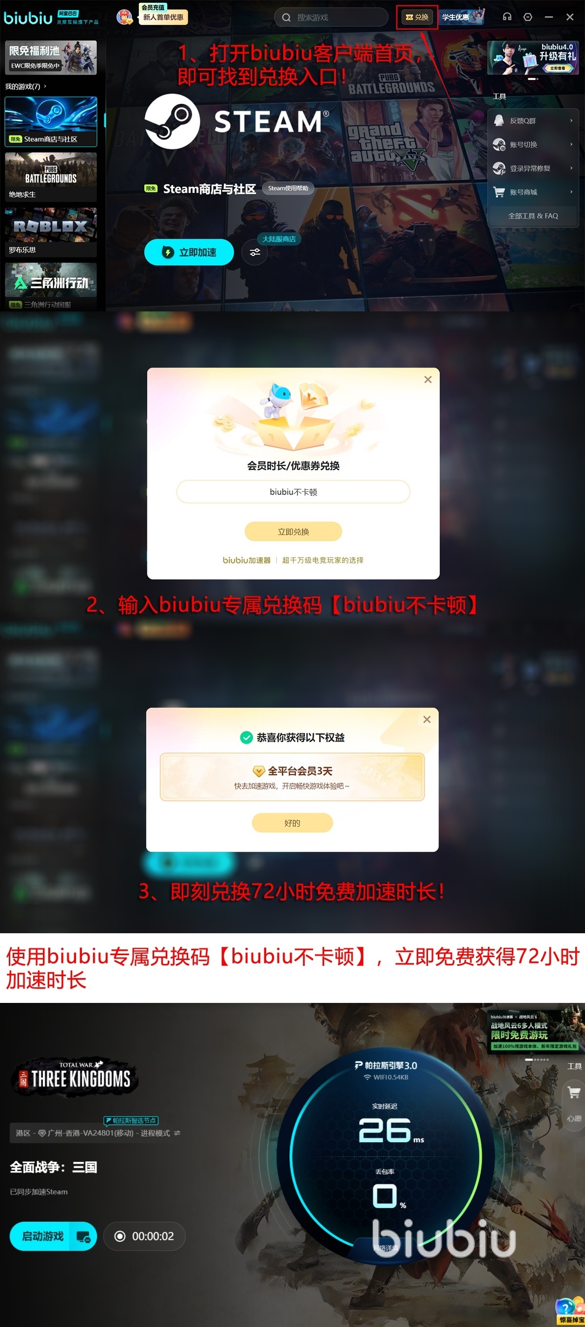 新人完成注册,系统就会送你24小时全功能的免费体验权益。输入激活码【biubiu不卡顿】,额外获赠72小时的服务时长,兑换福利是新老用户都能领取一次的。