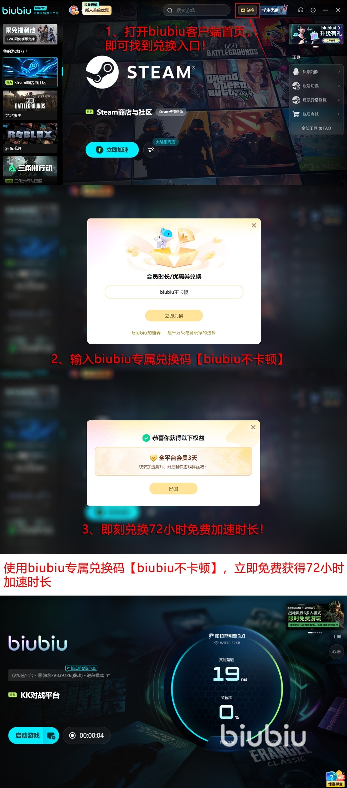 现在新人来注册,可以享受24小时免费加速时间,无套路登录就送,一键点击就能用。在客户端上输入口令码【biubiu不卡顿】,官方给各位新老用户赠送三天的免费使用时长,足够你跟好友把经典对战重温个遍。