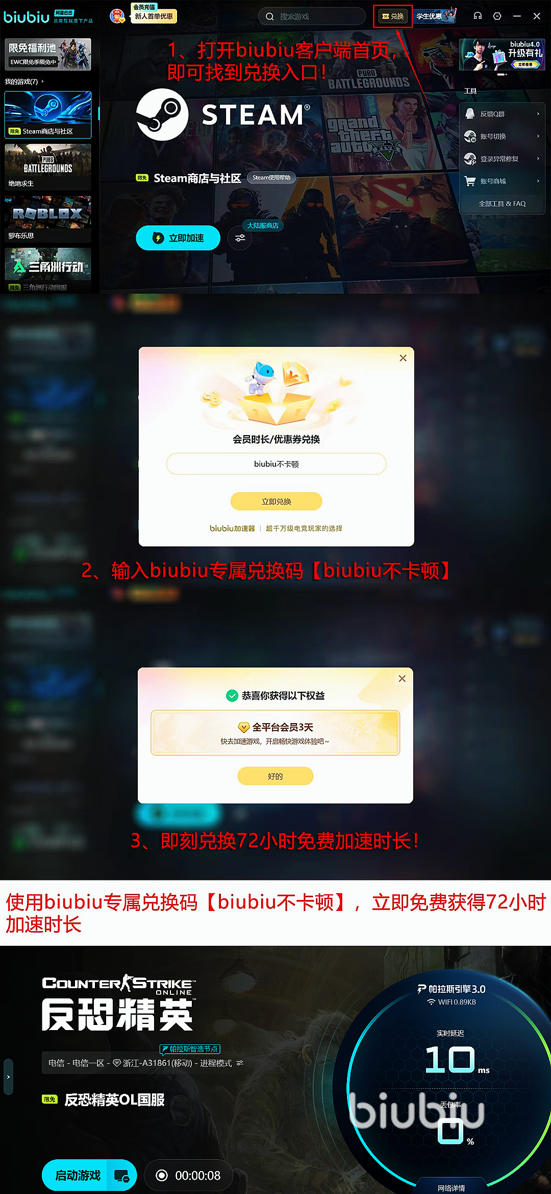同时新用户注册即可立即享受24小时全游戏不限速免费加速,各类游戏都能畅快运行无压力。全体用户在兑换中心输入【biubiu不卡顿】口令,可额外领取3天免费加速时长,降低游戏加速成本,其中新用户还可以累计叠加两项福利,获得96小时的免费加速,其福利方面还是很棒的。