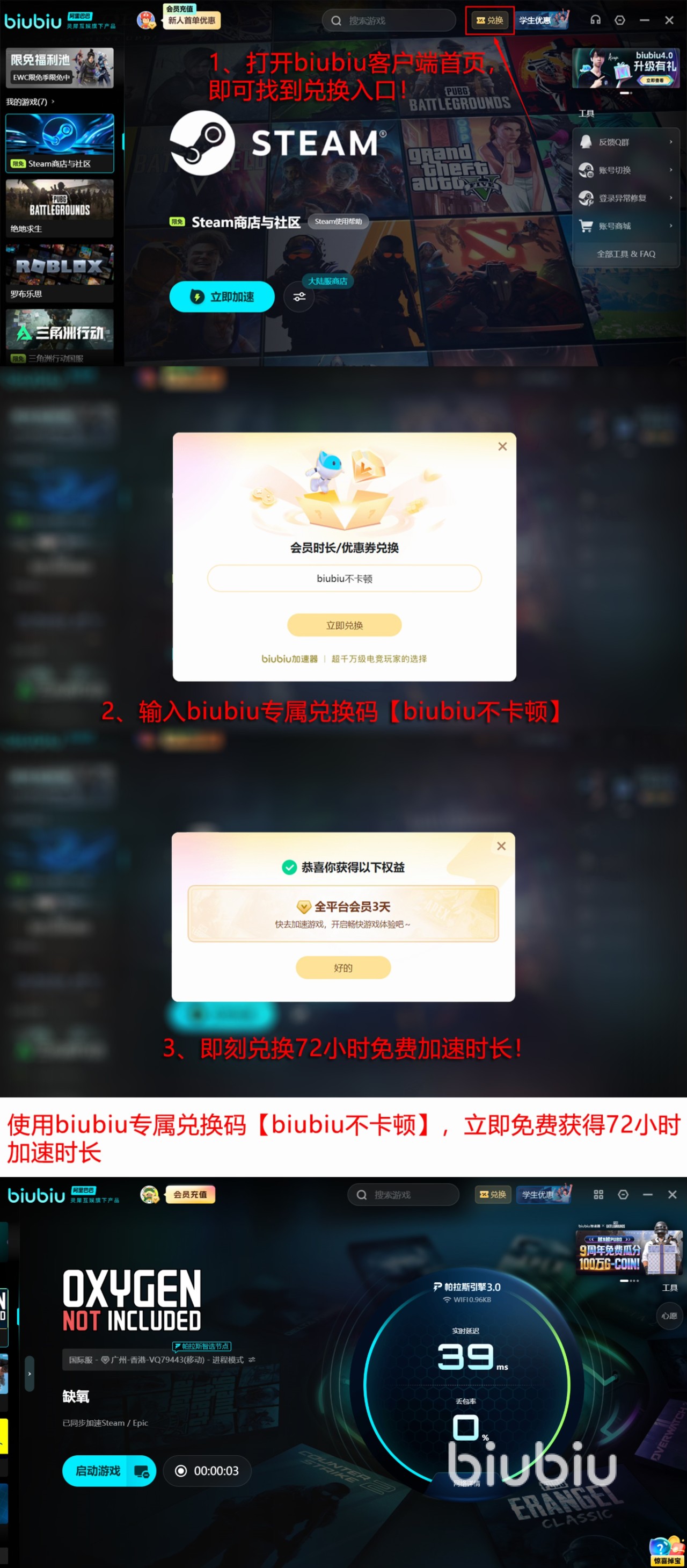 当然biubiu的良好口碑和它提供的多项免费体验活动脱不开关系,新人朋友们只要是首次登录注册,就会马上领到为期24小时的加速特权,还有【biubiu不卡顿】这个为所有同学准备的兑换口令,用了之后能再获得3天加速时长,也就是说新人累计能够获得96个小时的加速时间,可以趁这期间好好体验感受一下。