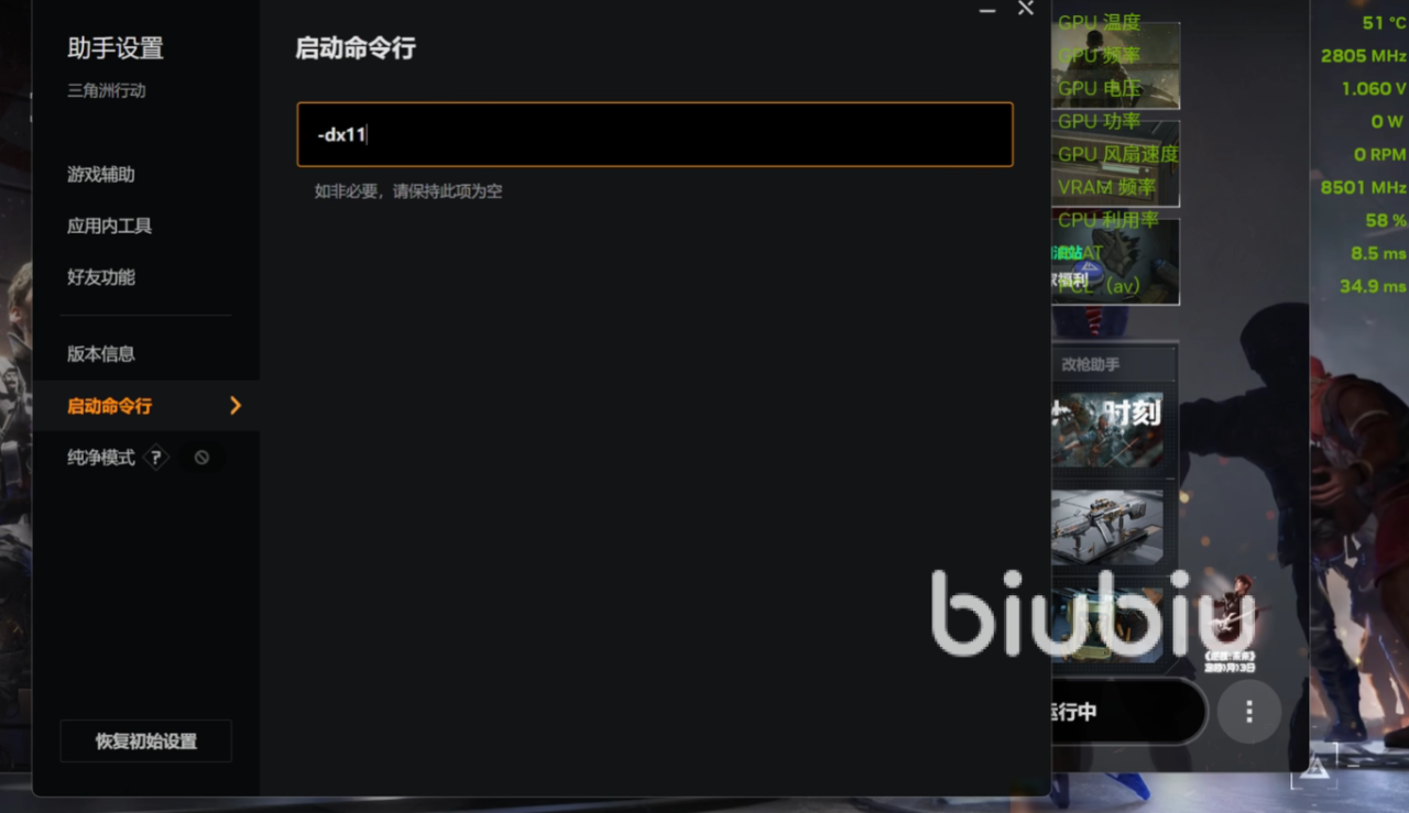 进入wegame的启动端,然后打开助手设置,点击启动命令行,然后输入“-dx11”这一个命令,再启动本体,看看加载页面上的着色器预热进度条是否在走动,如果进度条有反应,就是已经成功,等待片刻即可。不过这个命令对A卡的倍帧不起作用,如果你用的是a卡的话,建议将驱动退回581.01版本。