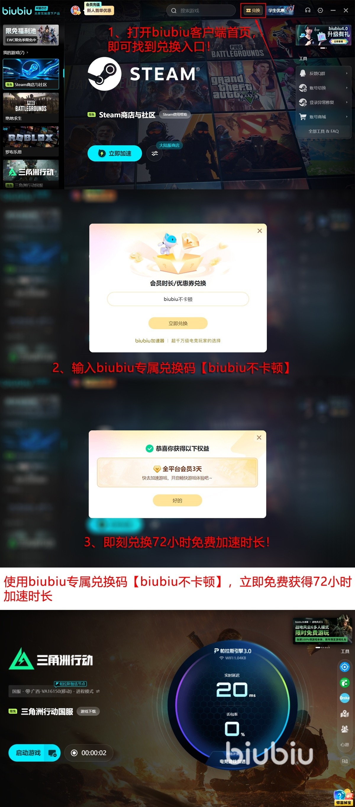 目前平台提供三天免费时长给各位新老用户,只要输入这个兑换码【biubiu不卡顿】就能够领取。而且还有好消息,如果你是新人则能再激活24小时的服务时长,两者叠加一起用,总计可享96小时无门槛加速服务。