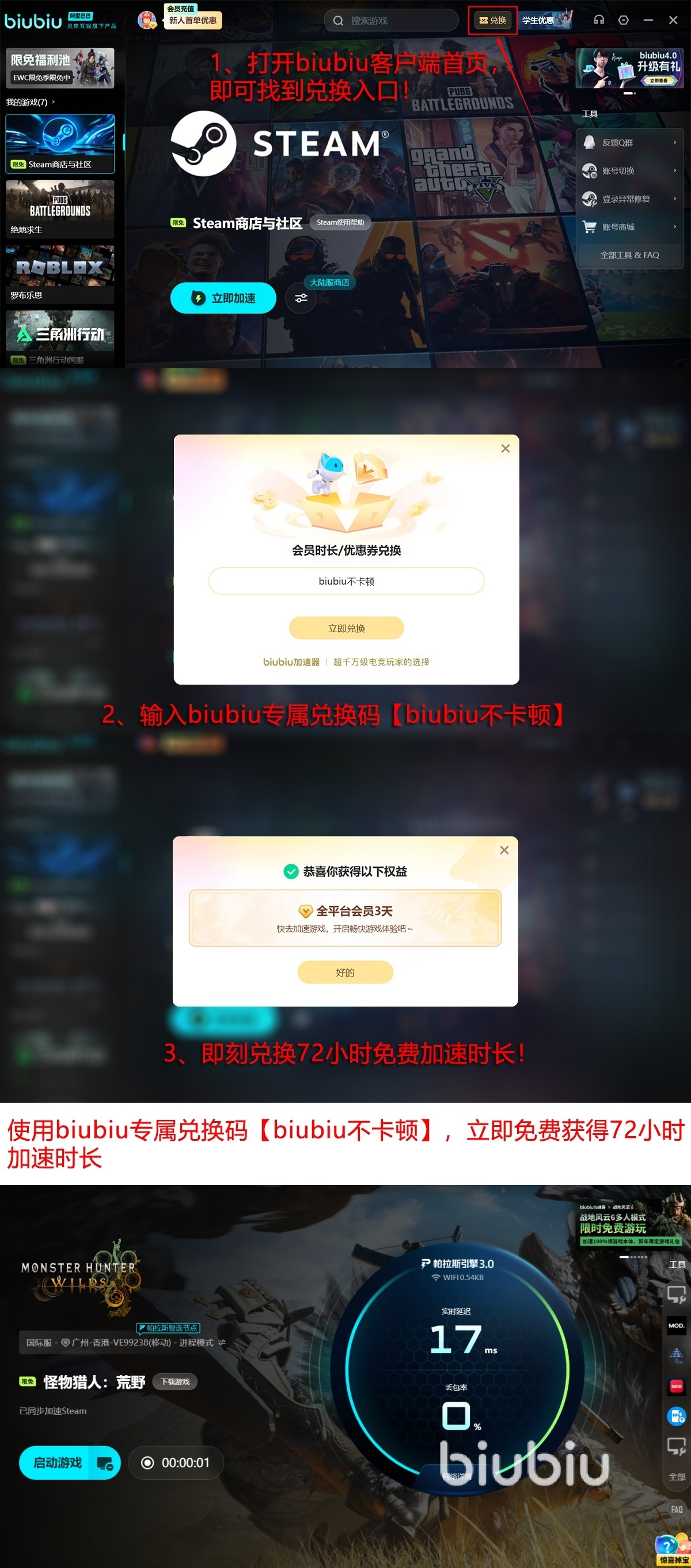 biubiu给新人带来无门槛见面礼,新用户注册成功登录就能够自动激活24小时全功能的使用时间。输入激活口令:【biubiu不卡顿】,新老用户们还能再领3天的免费时长,全程护航你的狩猎怪物之旅。