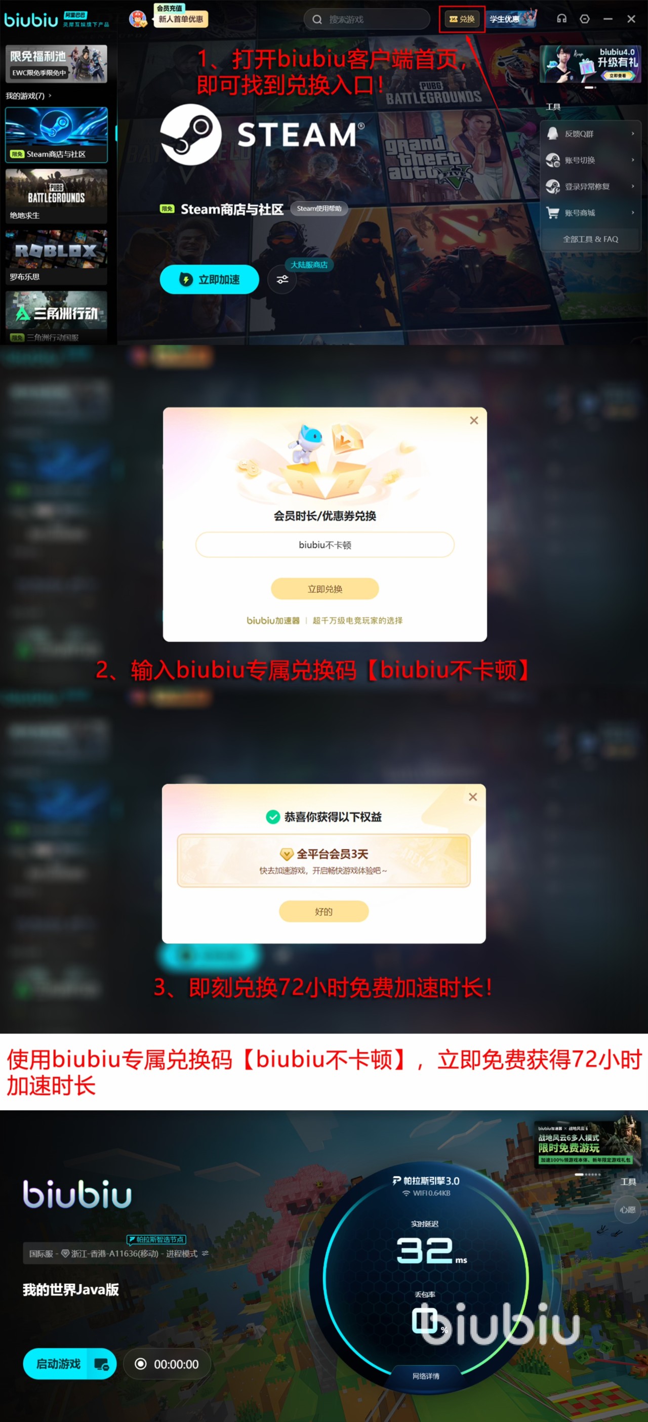 在启动加速后,玩家能很明显的感受到在高频操作时的流畅感,哪怕是多人联机模式下也不会有明显的顿挫感,想要尝试这样的加速效果,可以先利用下加速器上的福利活动,比如说新人专享的24h免费加速,新老用户都可以用【biubiu不卡顿】成功兑换3天时间的加速。