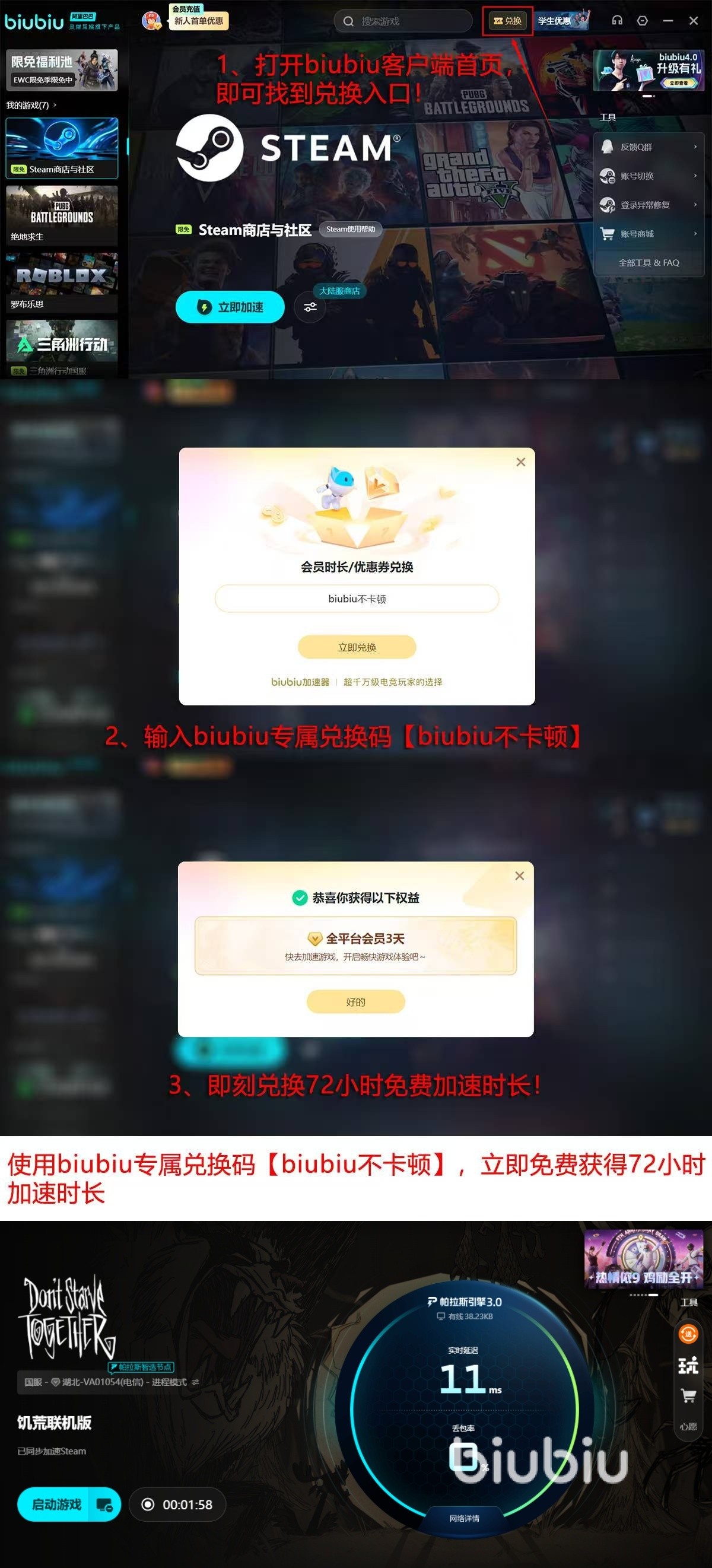 biubiu新人专享24小时免费加速,让你立刻体验飞一般的流畅!还有隐藏彩蛋:记住兑换码【biubiu不卡顿】,无论你是新用户还是老朋友,输入就能再得72小时免费时长!赶紧来薅羊毛吧!