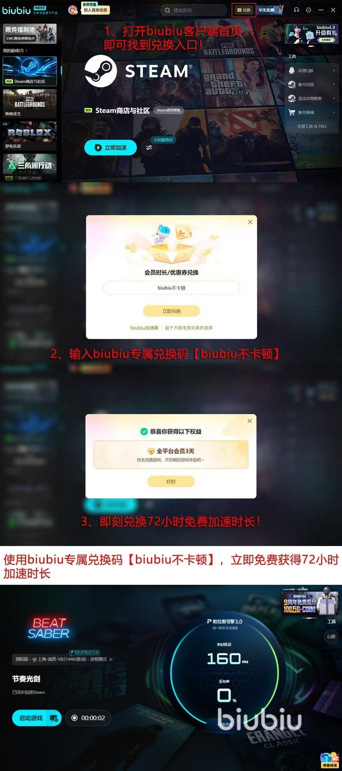 新用户注册之后可以立刻获得24小时全方位免费体验资格,输入【biubiu不卡顿】,还可以多加72小时加速时长,累计最高可达96小时的免费加速服务。