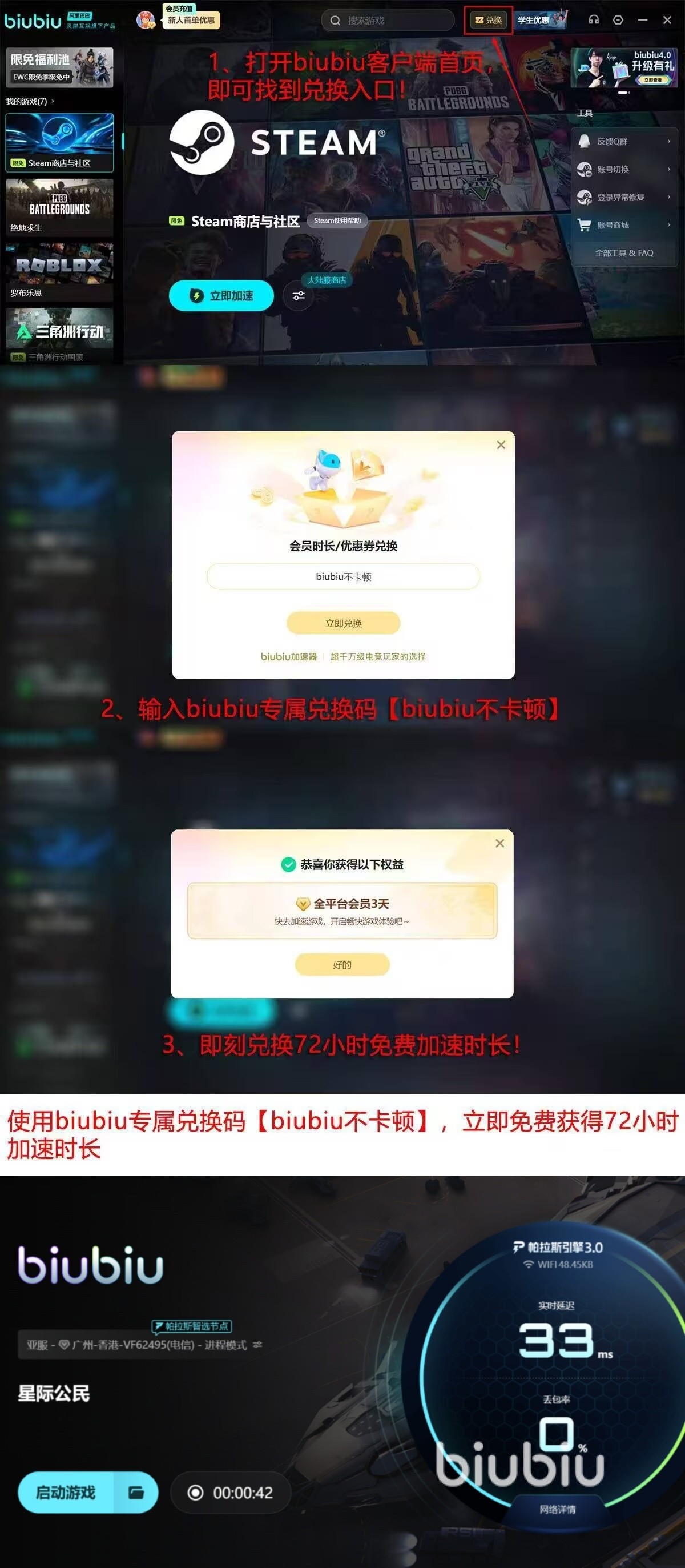 面对丰厚的福利,biubiu也是做到了满满的诚意;先是为新人准备了24小时全功能免费加速体验,只要你是初次注册登录就可以立马获取;而小写字母【biubiu卡顿】的这句专属口令,还能在原来的基础上,额外得到三天的继续免费优化时间,叠加到一起就是四天免费畅享体验时间,这一设计大幅度降低了伙伴们尝试的门槛,让大家在不同的场景下,能够畅快的体验该加速工具的优异性能。