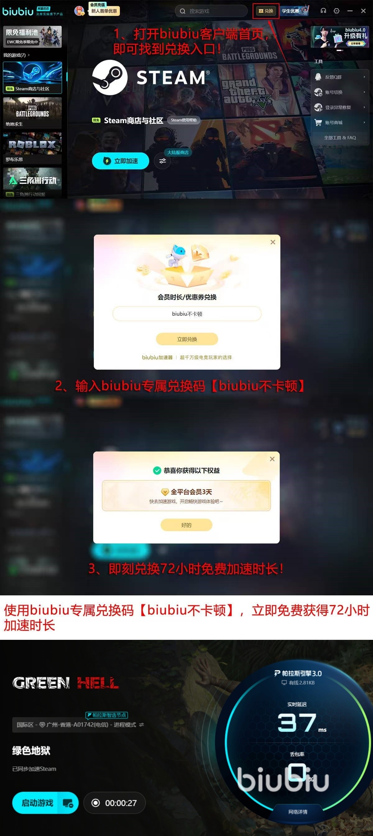 对于新用户,biubiu加速器的诚意满满,福利多多,现在开始注册即刻享有首次24小时全功能免费试用的权力,输入专属兑换码【biubiu不卡顿】还能额外领取72小时免费加速时长,继续在绿色地狱生存72小时,新人叠加享受顶级加速体验96小时!畅玩绿色地狱毫无压力。在技术方面大家也是不需要担心的,biubiu加速器是阿里巴巴灵犀互娱大厂的旗下产品,技术安全有保障。可以放心使用。