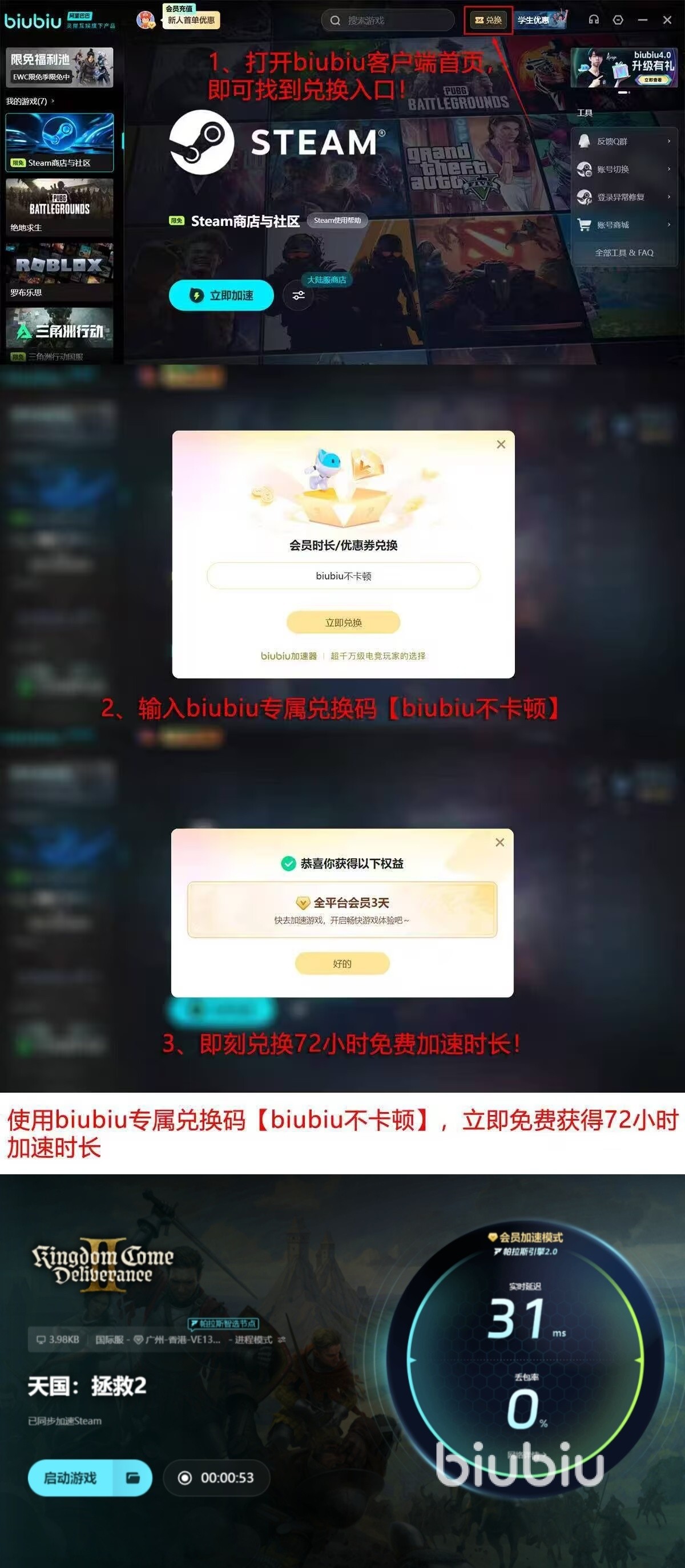 很多新手伙伴对于这个神器非常的好奇,都想来尝试一下,现在正好是大家入手的最佳时期,因为新手用户第一次注册是可以得到平台,为大家准备的24小时免费畅想权限,另外在兑换界面输入【biubiu不卡顿】这句口令,可以成功拿到三天免费加速的权限,全平台的所有游戏都可以免费享有加速服务,验证在不同网络环境下的稳定性,而无需承担任何失措成本,充分的体验加速器带来的流畅效果。