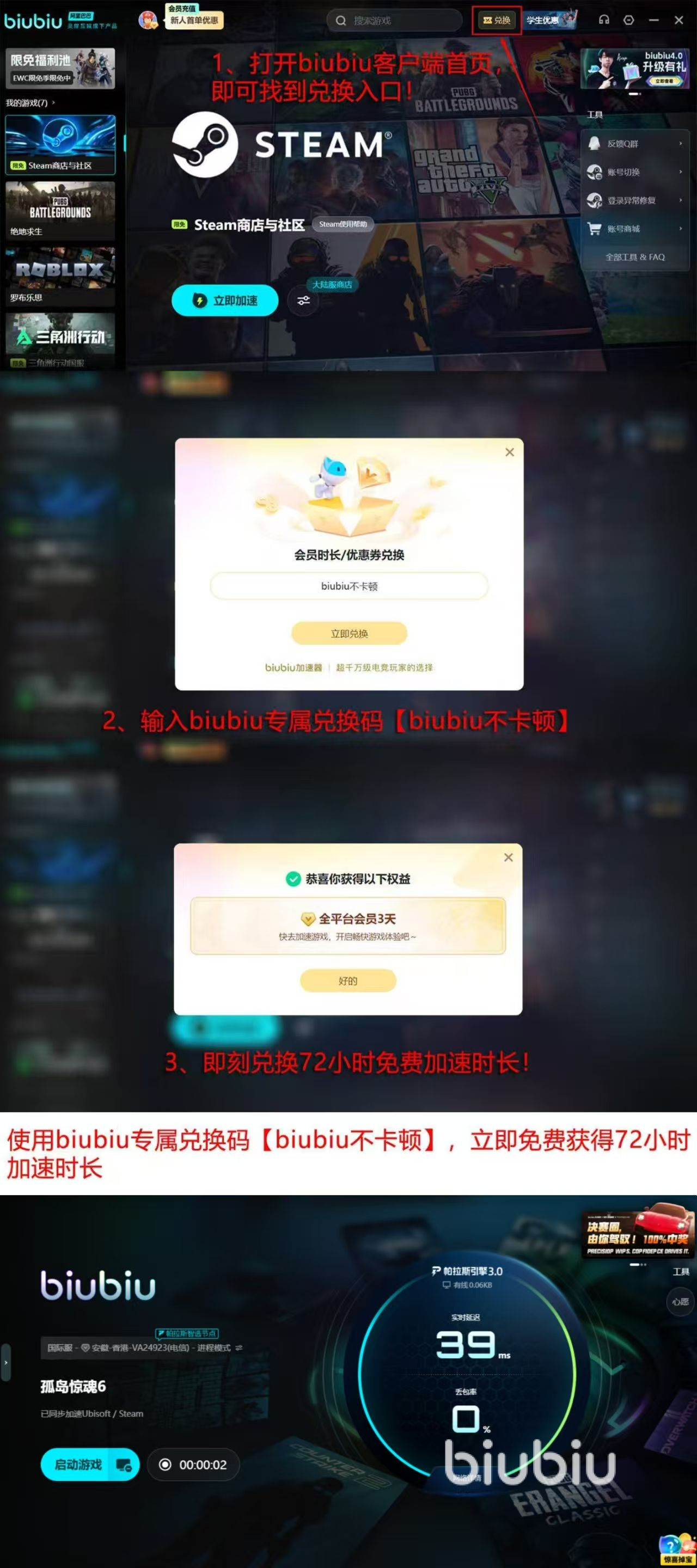 每一个注册用户都有24小时的免费试用时间。如果输入了对应的优惠码【biubiu不卡顿】,那么就会得到72小时全时段的使用权限,该服务方案不但充分考虑到用户体验的优化,而且对测试流程进行周密安排来检验网络状况以及设备是否兼容,在单人操作、团队配合以及实时竞技等各种情形下都能达成稳定的运行目的。