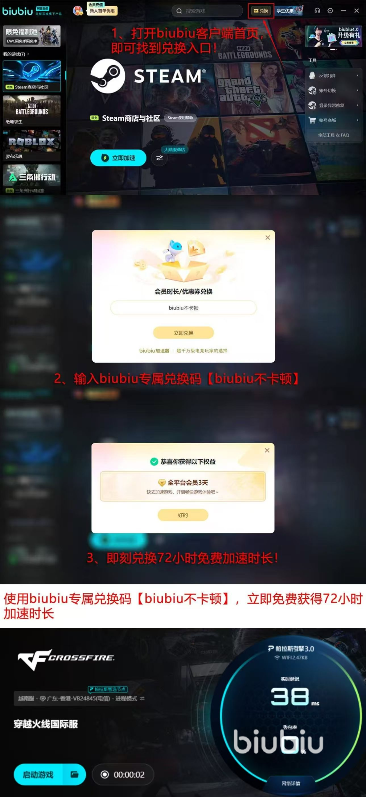 注册成功之后玩家有24小时的免费试用期。输入兑换码【biubiu不卡顿】之后就可享受72小时内无限次数的加速服务,新老用户均可享有该服务。这无疑给玩家提供了一个充足的时间来进行全面的稳定性测试,保证玩家可以不受网络干扰地进行高质量的游戏体验。