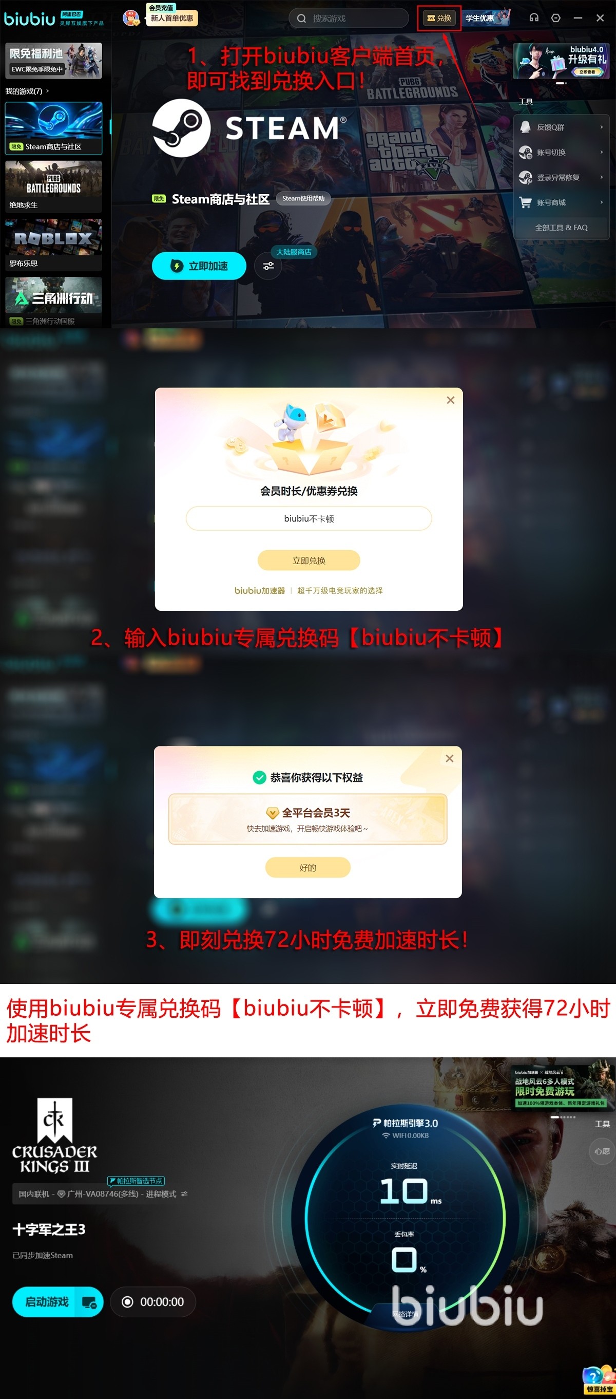 新人注册以后,可以获得24小时使用时间,足以让你玩几把来验证效果。想要领取更多时长,就快来输入【biubiu不卡顿】兑换码,不论新老用户都能领取3天体验时间,实打实的福利送给大家。