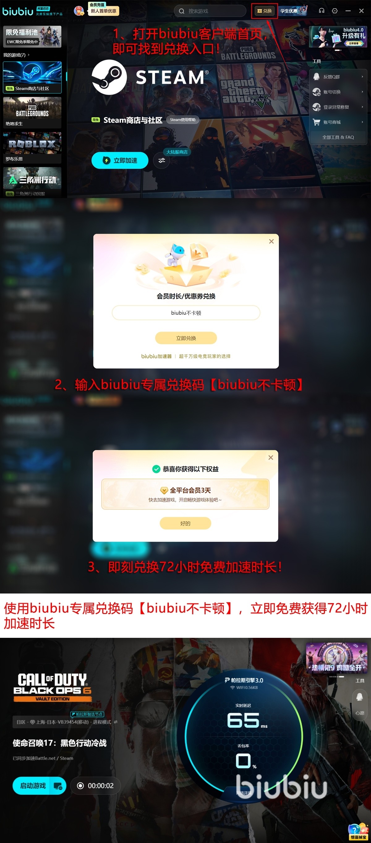 当前所有新老用户都有三天的免费使用机会,只需输入【biubiu不卡顿】来兑换即可。而且如果你是从未使用过biubiu的新人,首次登录还能够领得24小时的免费体验时长,两项福利叠加起来能够加长至96小时,足以让你去感受火力全开的丝滑手感。