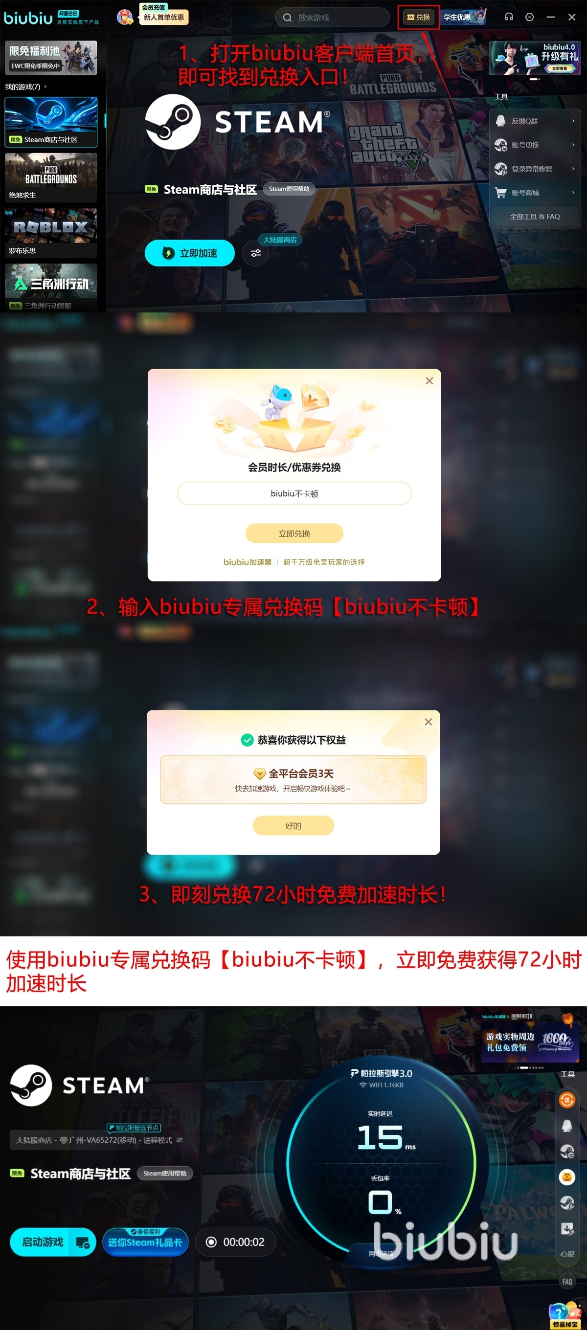 新人注册新号登录,立刻享受24小时的全功能免费体验;而且新老用户们,再来首页兑换栏输入【biubiu不卡顿】口令码,还能够拿三天的免费加速时间,足够你去开几把大乱斗来检查帧率优化情况。