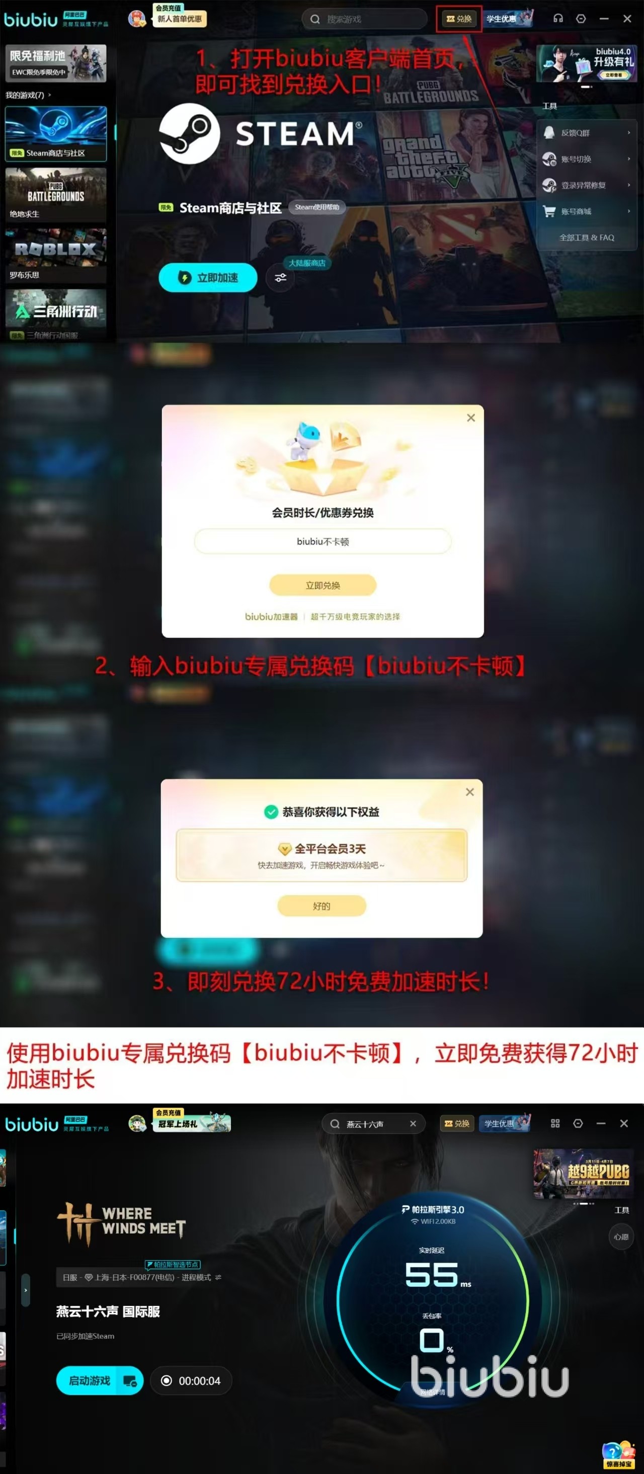 还要分享给大家的是biubiu加速器现在的多重福利,新人第一次注册并登录就能免费加速24小时,再输入兑换码【biubiu不卡顿】就又能获得72小时免费加速,也就是96小时0元投入,还能享受高质量网络不卡顿畅玩,这么好的机会玩到就是赚到。当然,老用户也能用兑换码享受免费加速,如果想充值会员,不同的时长也都有优惠,而且时间越长越划算。