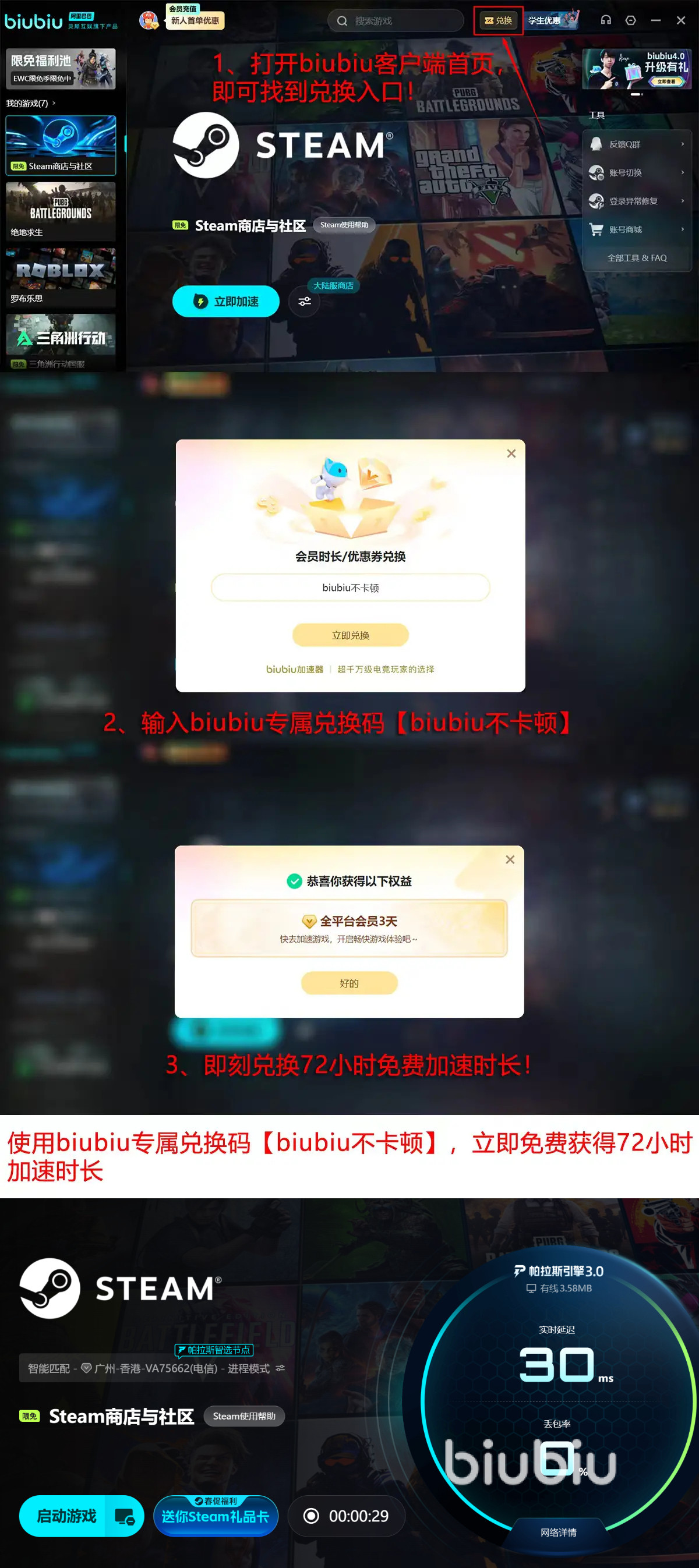 再好的评测也不如玩家自己上手尝试,现在新用户福利很多,注册即可获取一天的免费不限游戏加速时长,输入兑换码【biubiu不卡顿】还能额外领取3天的时长,当然,这个兑换码老用户也可以使用,新人叠加时长一算,就是4天的免费加速时长。